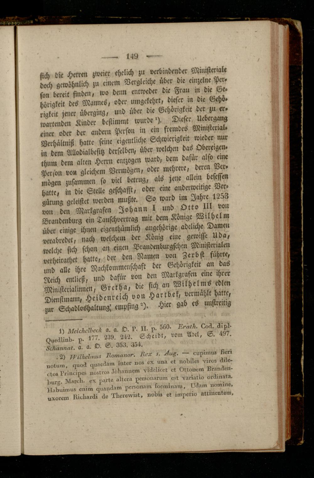 sich die Herren zweier ehelich zn verbindender Ministeriale doch gewöhnlich zu einem Vergleiche über die einzelne Per» son bereit finden, wo denn entweder die Frau in die Ge» Hörigkeit des Mannes, oder umgekehrt, dieser in die Gehö- rigkeit jener überging, und über die Gchörigkcit der zu er» wartenden Kinder bestimmt wurde'). Dieser Uebergang einer oder der andern Person in ein fremdes Ministerial» Verhältniß hatte seine eigentliche Schwierigkeit wieder nur in dem Allodialbcsitz derselben, über welchen das Obereigen» thum dem alten Herrn entzogen ward, dem dafür also eine Person von gleichem Vermögen, oder mehrere, deren Ver» mögen zusammen so viel betrug, als jene allein besessen hatte, in die Stelle geschafft, oder eine anderweitige Ver» gütung geleistet werden mußte. So ward im Jahre 1253 von den Markgrafen Johann I und Otto IH von Brandenburg ein Lauschvertrag mit dem Könige Wilhelm über einige ihnen eigenthümlich angchörige adeliche Damen verabredet, nach welchem der König eine gewisse Uda, welche sich schon an einen Vrandenburgschen Ministerialen verheirathet hatte, der den Namen von Zerbst führte, und alle ihre Nachkommenschaft der Gehörigkeit an das Reich entließ, und dafür von den Markgrafen eine ihrer Ministerialinnen, Gr et ha, die sich an Wilhelms edlen Dienstmann, Heidenreich von Hartbek, vermählt hatte, zur Schadloshaltung! empfing *), Hier gab es unstreitig