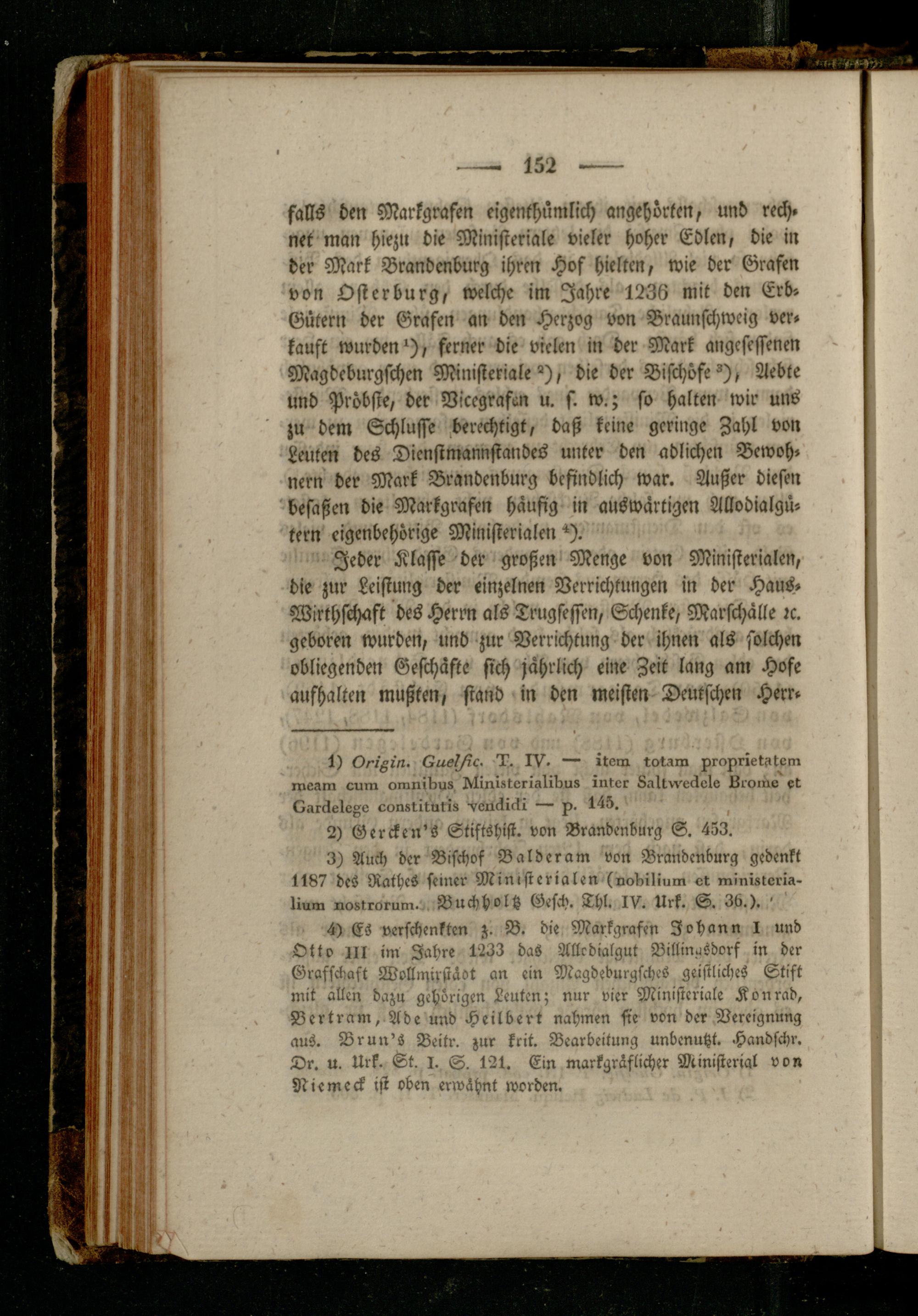 falls den Markgrafen eigenthümlich angehörtcn, und rech, net man hiezu die Ministeriale vieler hoher Edlen, die in der Mark Brandenburg ihren Hof hielten, wie der Grafen von Osterburg, welche im Jahre 1236 mit den Erb» Gütern der Grafen an den Herzog von Braunfchweig ver» kauft wurden I, ferner die vielen in der Mark angesessenen Magdeburgschen Ministeriale"), die der Bischöfe ^), Aebte und Pröbste, der Vicegraftn u. s. w.; so halten wir uns zu dem Schlüsse berechtigt, daß keine geringe Zahl von Leuten des Dienstmannstandes unter den erblichen Bewoh» nern der Mark Brandenburg befindlich war. Außer diesen 'befaßen die Markgrafen häufig in auswärtigen Allodialgü- tern eigenbehörige Ministerialen^).