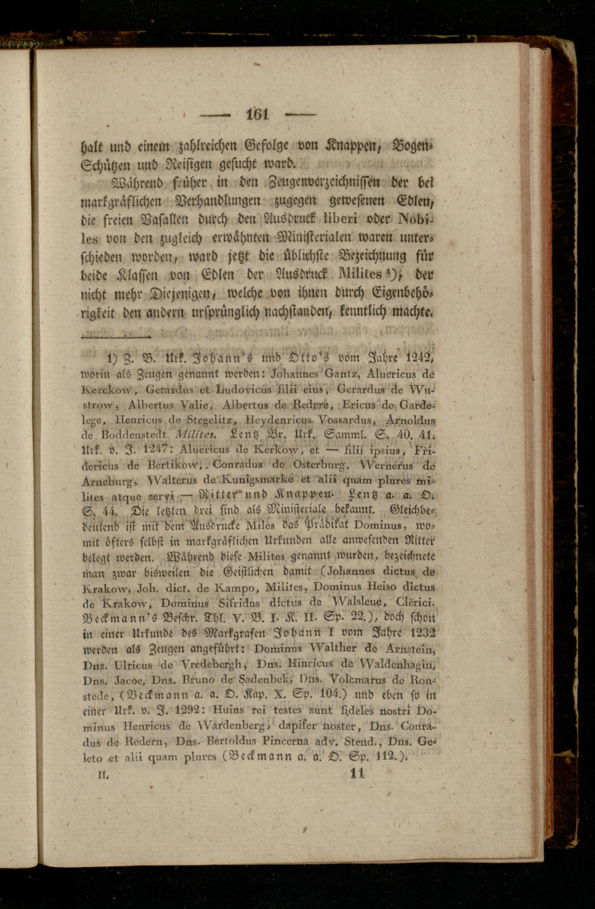 litos atguo servi " Ritter'und Knappen- Lentz a- a. O. S. 44. Die letzten drei sind als Ministerielle bekannt. Gleichbedeutend ist mit dem Ausdrucke Hlilo» das Prädikat Dominus, womit öfters selbst in markgräflichen Urkunden alle anwesenden Ritter belegt werden. Während diese ^lilitos genannt wurden, bezeichnet«: man zwar bisweilen die Geistlichen damit (äokmnnes -lictus cts Krak-orv, äoki. cklct. -ko K.amp», Mikitos, Dominus Iloiso cklctu» -ko K,rak-.o-v, Domiüus Likrilkus cklctu» cle 4V->kskouö, Okörioi. Beckmann's Beschr. Thl. V- B. 1- K. II- Sp. 22.), doch schon in einer Urkunde deS Markgrafen Johann I vom Jahre 1232 werden als Zeugen angeführt: Dominus Waktkrer cko Krnstoin, Uns. Dkricus cko Vreäekrorglr, Dns. Kinricu» cks VValckonkiagiu. Do«. äaooo, Dns. Kruno cko' L-rckenkiokc, Iltis. Vokcmaius cko Kon- stocke, (Beckmann a. a. O. Kap. X. Sp. 104.) und eben so in einer Urk. v. I. 1292: Rums roi tost« sunt tsckeles nostri Oo- minu» Ikenricns cko VVarckonder-; > ckapikor Noster, Uns. Donrä- ciu» -ko Köckern, Dns. Kertnkckus kinceina ack-r. 8tenä., Dns. Oe- Icto ot -ckü -guam pkures (Beckmann a. Ü. O. Sp. 112.),