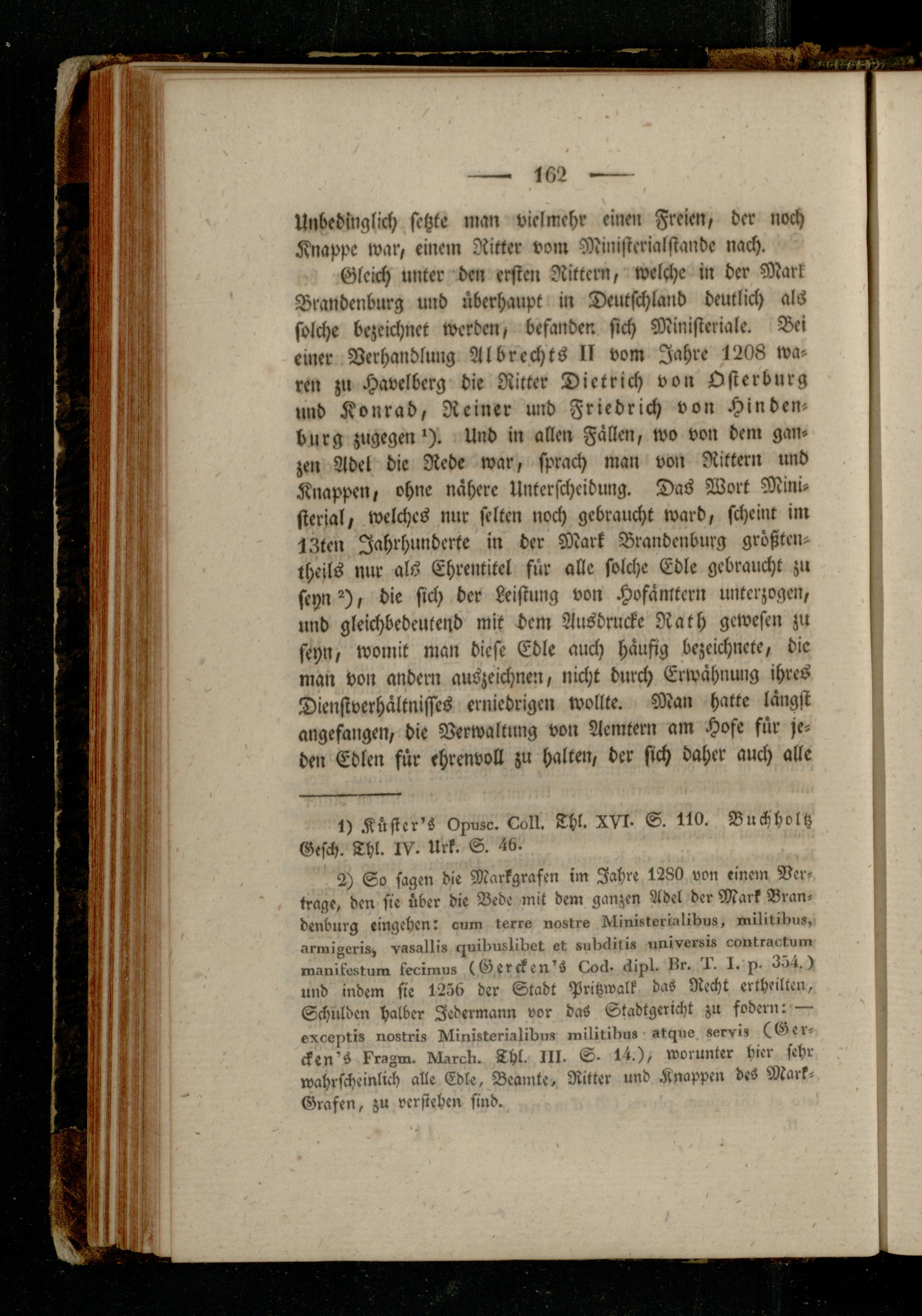 Gleich unter den ersten Rittern, welche in der Mark Brandenburg und überhaupt in Deutschland deutlich als solche bezeichnet werden, befanden sich Ministeriale. Bei einer Verhandlung Albrechts II vom Jahre 1208 waren zu Havelberg die Ritter Dietrich von Osierburg und Konrad, Reiner und Friedrich von Hinden« bürg zugegen*). Und in allen Fällen, wo von dem ganzen Adel die Rede war, sprach man von Rittern und Knappen, ohne nähere Unterscheidung. Das Wort Mini- sterial, welches nur selten noch gebraucht ward, scheint im 13ten Jahrhunderte in der Mark Brandenburg größten- theils nur als Ehrentitel für alle solche Edle gebraucht zu seyn 2 ), die sich der Leistung von Hofämtcrn unterzogen, und gleichbedeutend mit dem Ausdrucke Rath gewesen zu seyn, womit man diese Edle auch häufig bezeichnete, die man von andern auszeichnen, nicht durch Erwähnung ihres Dienstverhältnisses erniedrigen wollte. Man hatte längst angefangen, die Verwaltung von Aemtern am Hofe für jeden Edlen für ehrenvoll zu halten, der sich daher auch alle