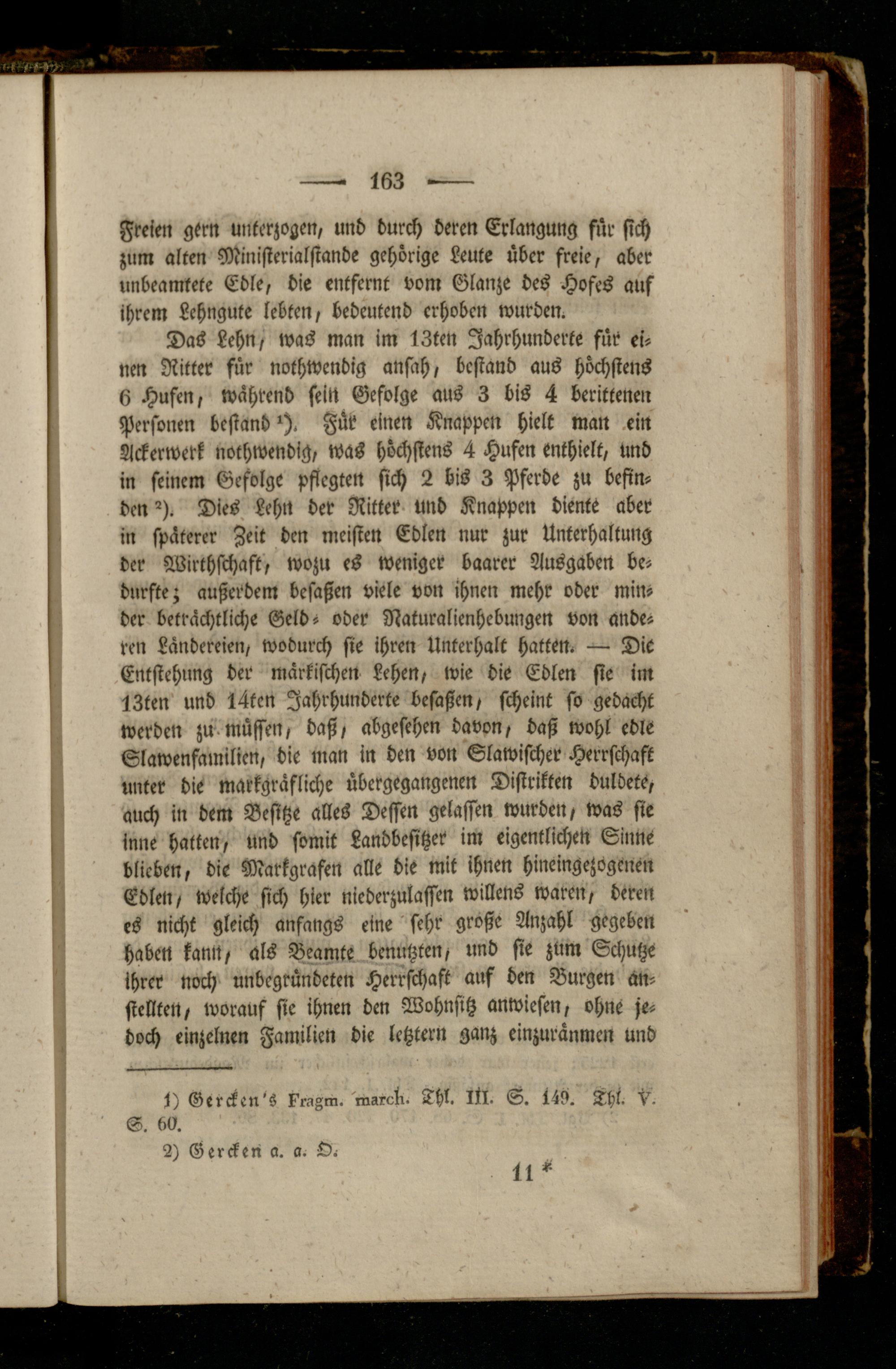 Das Lehn, was man im 13ten Jahrhunderte für einen Ritter für nothwcndig ansah, bestand aus höchstens 6 Hufen, während sein Gefolge aus 3 bis 4 berittenen Personen bestand'). Für einen Knappen hielt man ein Ackerwerk nochwendig, was höchstens 4 Hufen enthielt, und in seinem Gefolge pflegten sich 2 bis 3 Pferde zu befinden °). Dies Lehn der Ritter und Knappen diente aber in späterer Zeit den meisten Edlen nur zur Unterhaltung der Wirthfchaft, wozu es weniger baarer Ausgaben bedurfte; außerdem besaßen viele von ihnen mehr oder minder beträchtliche Geld- oder Naturalienhebungen von anderen Ländereien, wodurch sie ihren Unterhalt hatten. — Die Entstehung der märkischen Lehen, wie die Edlen sie im 13ten und l4tcn Jahrhunderte besaßen/ scheint so gedacht werden zu müssen, daß, abgesehen davon, daß wohl edle Slawenfamilien, die man in den von Slawischer Herrschaft unter die markgräfliche übergegangenen Distrikten duldete, auch in dem Besitze alles Dessen gelassen wurden, was sie inne hatten, und somit Landbesitzer im eigentlichen Sinne blieben, die Markgrafen alle die mit ihnen hineingezogenen Edlen, welche sich hier niederzulassen willens waren, deren es nicht gleich anfangs eine sehr große Anzahl gegeben haben kann, als Beamte benutzten, und sie zum Schutze ihrer noch unbegründeten Herrschaft auf den Burgen an- stcllten, worauf sie ihnen den Wohnsitz anwiesen, ohne jedoch einzelnen Familien die letzter» ganz einzuranmen und