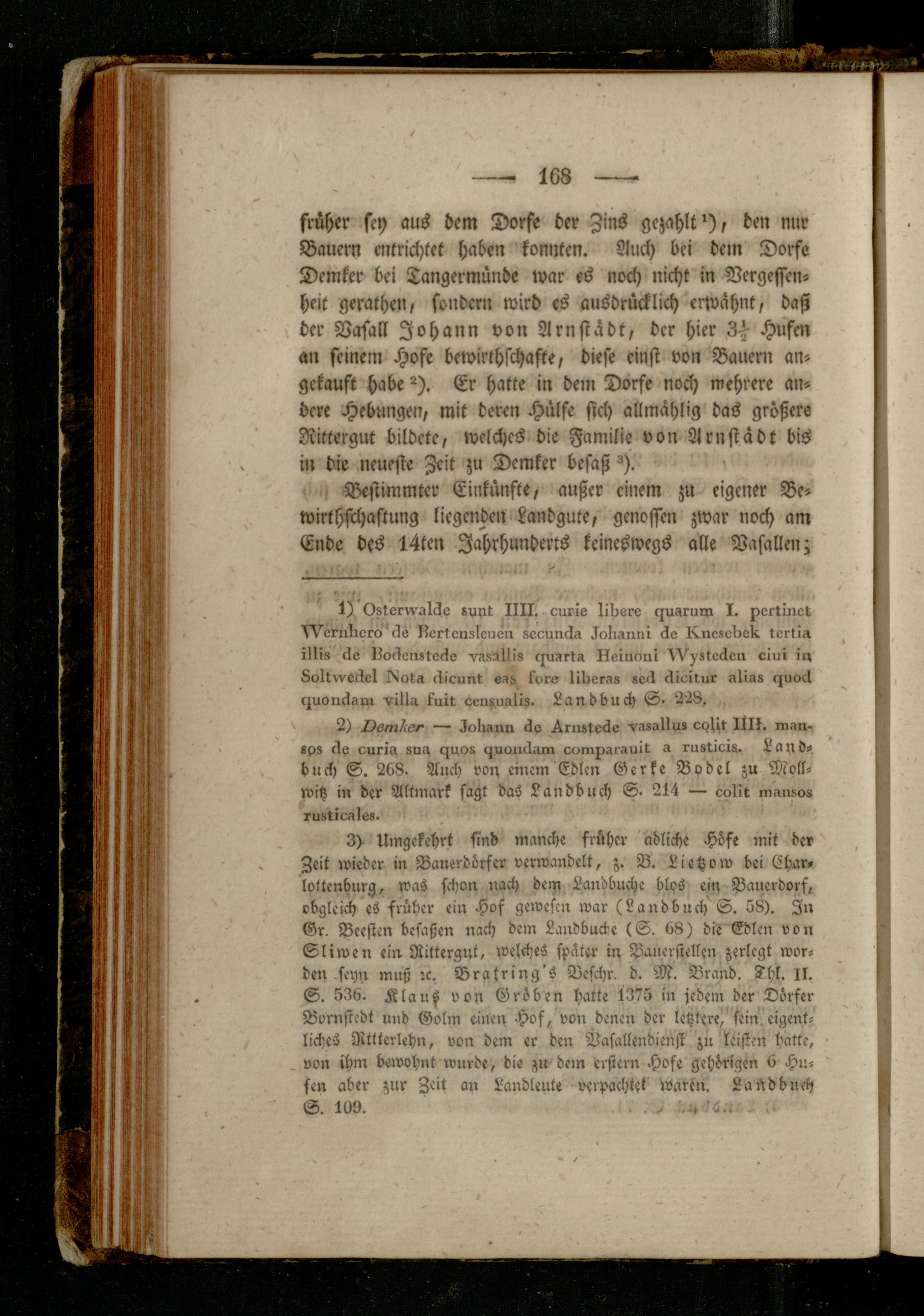 früher sey aus dem Dorfe der Zins gezahlt'), den nur Bauern entrichtet haben konnten. Auch bei dem Dorfe Demker bei Tangermünde war es noch nicht in Vergessenheit gerathen, sondern wird es ausdrücklich erwähnt, daß der Vasall Johann von Arnstädt, der hier Hufen an feinem Hofe bewirthschaste, diese einst von Bauern angekauft habe r). Er hatte in dem Dorfe noch mehrere andere Hebungen, mit deren Hülfe sich allmählig das größere Rittergut bildete, welches die Familie von Arnstädt bis in die neueste Zeit zu Demker besaß ^).