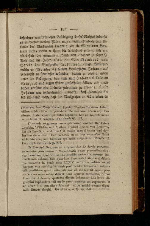 besonder» markgräflichen Bestätigung dieses Rechtes bedurfte es in verkommenden Fällen nickst, wem es gleich eine Urkunde des Markgrafen Ludwig an die Edlen von Bre- dow giebt, worin er ihnen die Erlaubnist erthcilt, sich mit Vorbehalt der gesammtcn Hand von einander zu setzen *). Auch bat im Jahre 1314 ein Edler Reinhard von Strele den Markgrafen Wolde mar, einige Einkünfte, welche er (Reinhard) seinem Brudersohne Johann auf Lebenszeit zu überlassen wünschte, diesem zu Lehn zu geben unter der Bedingung, daß diese nach Johann's Tode au Reinhard und dessen Erben zurückfallen sollten, und ihnen beiden darüber eine Urkunde zukommen zu lassen ^). Dieser Johann war wahrscheinlich unbeerbt. Auf Lebenszeit findet sich sonst nicht, daß die Markgrafen an Edle Lehen er-