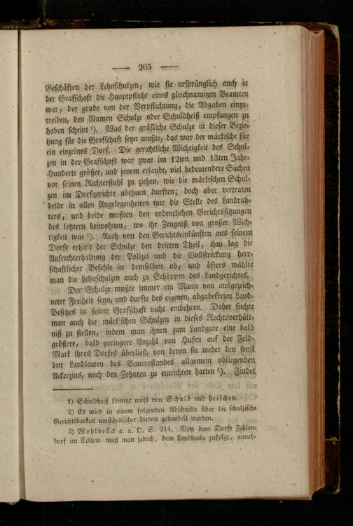 Geschäften der Lchnschulzm, wie sie ursprünglich auch in der Grafschaft die Hauptpflicht eines gleichnamigen Beamten war, der grade von der Verpflichtung, die Abgaben einzu- treiben, den Namen Schulze oder Schuldheiß empfangen zu haben scheint*). Was der gräfliche Schulze in dieser Bezie» hung für die Grafschaft seyn mußte, das war der märkische für ein einzelnes Dorf. Die gerichtliche Wichtigkeit des Schulzen in der Grafschaft war zwar im 12ten und iZten Jahr- Hunderte größer, und jenem erlaubt, viel bedeutendere Sachen vor seinen Richterstuhl zu ziehen, wie die märkischen Schulzen im Dorfgerichte abthucn durften; doch aber vertraten beide in allen Angelegenheiten nur die Stelle des Landrichters, und beide mußten den ordentlichen Gerichtssitzungen des letztem beiwohnen, wo ihr Zeugniß von großer Wichtigkeit war 2 ). Auch von den Gerichtseinkünften aus seinem Dorfe erhielt der Schulze den dritten Theil, ihm lag die Aufrechterhaltung der Polizei und die Vollstreckung herrschaftlicher Befehle in demselben ob, und öfters wählte man die Lehnschnlzen auch zu Schöppen des Landgerichtes.