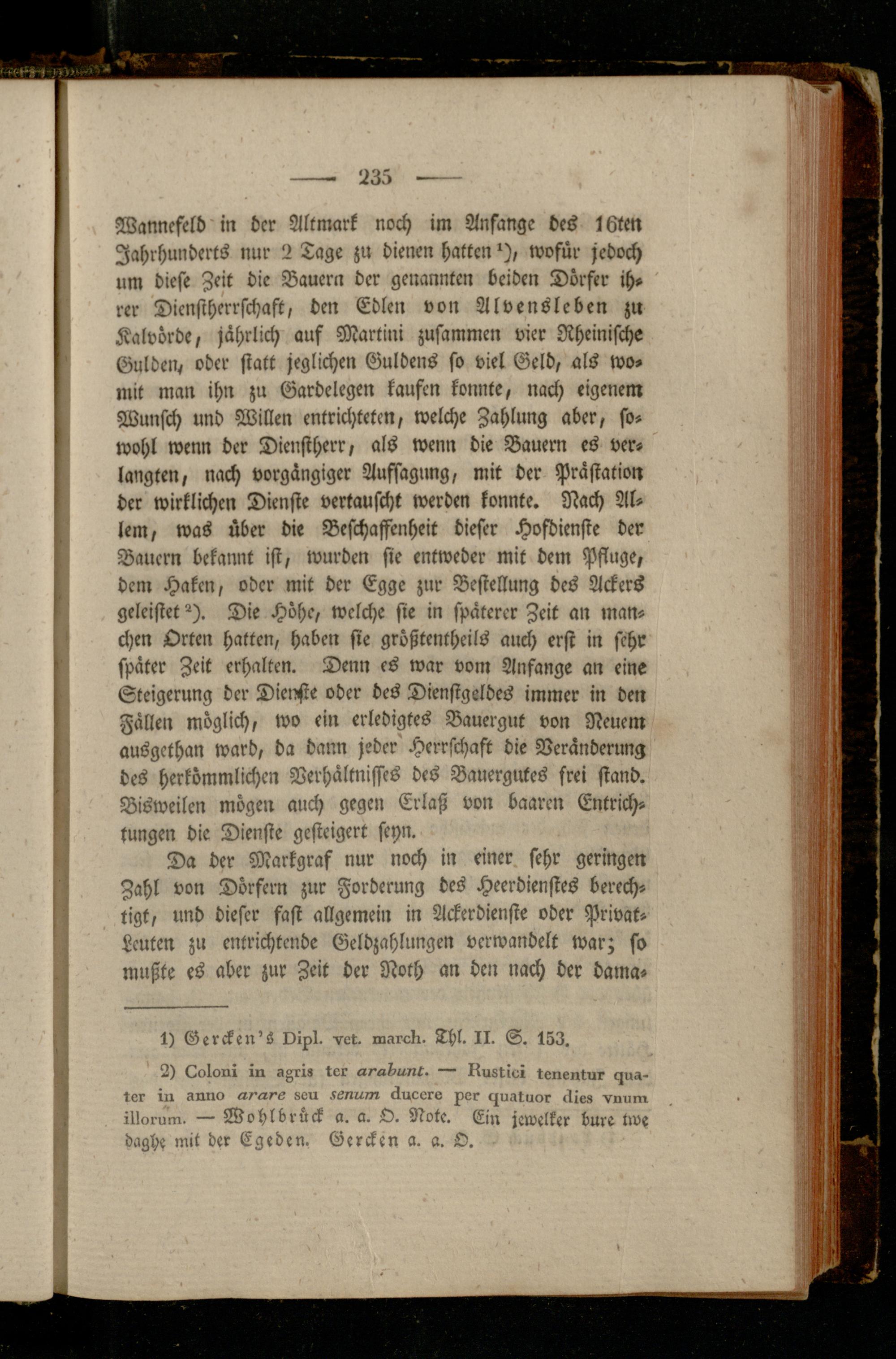 Wannefelb in der Altmark noch im Anfänge des 16ten Jahrhunderts nur 2 Tage zu dienen hatten *), wofür jedoch um diese Zeit die Bauern der genannten beiden Dörfer ihrer Dienstherrschaft, den Edlen von Alvensleben zu Kalvörde, jährlich auf Martini zusammen vier Rheinische Gulden, oder statt jeglichen Guldens so viel Geld, als womit man ihn zu Gardelegen kaufen konnte, nach eigenem Wunsch und Willen entrichteten, welche Zahlung aber, sowohl wenn der Dienstherr, als wenn die Bauern es verlangten, nach vorgängiger Aufsagung, mit der Prästatiou der wirklichen Dienste vertauscht werden konnte. Nach Allem, was über die Beschaffenheit dieser Hofdienste der Bauern bekannt ist, wurden sie entweder mit dem Pfluge, dem Haken, oder mit der Egge zur Bestellung des Ackers geleistet Die Höhe, welche sie in späterer Zeit an manchen Orten hatten, haben sie größtentheils auch erst in sehr später Zeit erhalten. Denn cs war vom Anfänge an eine Steigerung der Dienste oder des Dienstgeldes immer in den Fällen möglich, wo ein erledigtes Bauergut von Neuem ausgcthan ward, da dann jede? Herrschaft die Veränderung des herkömmlichen Verhältnisses des Bauergutes frei stand. Bisweilen mögen auch gegen Erlaß von baaren Entrichtungen die Dienste gesteigert seyn.