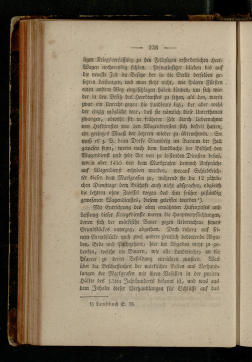 ligen Kriegsverfassung zu den Feldzügen erforderlichen Heer- Wagen nothwendig fehlen. Privatbesitzer blieben bis auf die neueste Zeit im Besitze der in die Stelle derselben gesetzten Leistungen, und man sieht nicht, wie spätere Fürsten » einen andern Weg cingeschlagen haben können, um sich wieder in den Besitz des Hecrdienstes zu fetzen, als den, worin zwar ein Unrecht gegen die Landleute lag, der aber wohl der einzig mögliche war, daß sie nämlich diese Unterthanen zwangen, obwohl sie in früherer Zeit durch Ucbernahme von Hofdiensien von den Wagendiensten sich befreit hatten, ein geringes Maaß der letzter» wieder zu übernehmen. So muß es z. B. beim Dorfe Blumberg im Barnim der Fall gewesen seyn^ worin nach dem Landbuche der Bischof den Wagendienst und jede Art von zu leistenden Diensten besaß, worin aber >455 von dem Markgrafen dennoch Ansprüche auf Wagendienst erhoben wurden, worauf Schiedsrichter diesen dem Markgrafen zu, während sie die 12 jährlichen Diensttage dem Bischöfe auch nicht abfprachen, obgleich die letztem ohne Zweifel wegen des ihm früher zuständig gewesenen Wagendienstes, diesem geleistet wurden*).