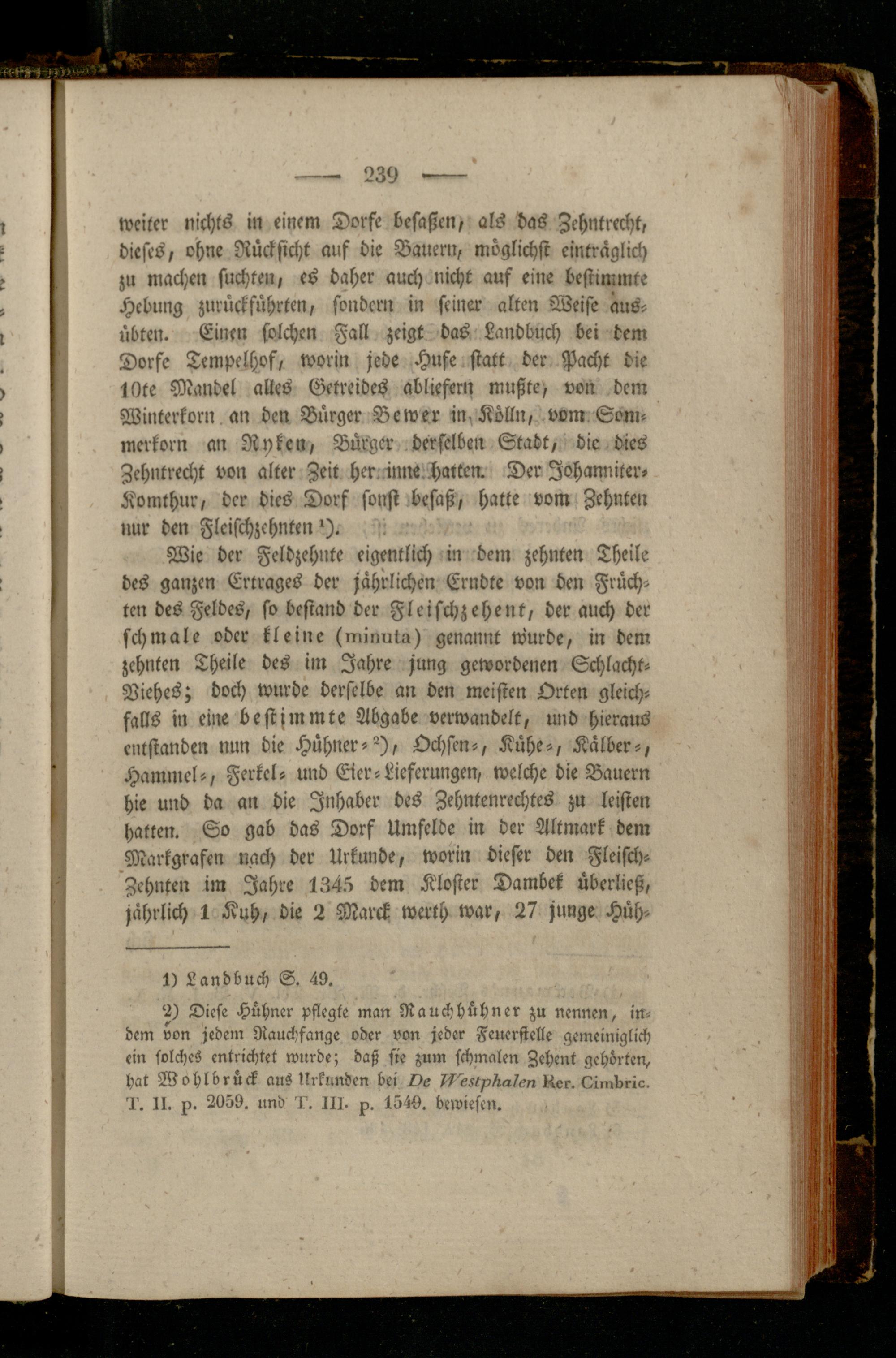 Wie der Feldzehnte eigentlich in dem zehnten Theile des ganzen Ertrages der jährlichen Erndte von den Früchten des Feldes, so bestand der Fleisch; ehe nt, der auch der schmale oder kleine (minuta) genannt tvurde, in dem zehnten Theile des im Jahre jung gewordenen Schlacht- Viehes; doch wurde derselbe an den meisten Orten gleichfalls in eine bestimmte Abgabe verwandelt, und hieraus entstanden nun die Hühner-^), Ochsen-, Kühe-, Kälber-, Hammel-, Ferkel- und Eler-Lieferungen, welche die Bauern hie und da an die Inhaber des Zehntenrechtes zu leisten hatten. So gab das Dorf Umfelde in der Altmark dem Markgrafen nach der Urkunde, worin dieser den Fleisch- Zehnten im Jahre 1345 dem Kloster Dambek überließ, jährlich 1 Kuh, die 2 Marck werth war, 27 junge Hüh-