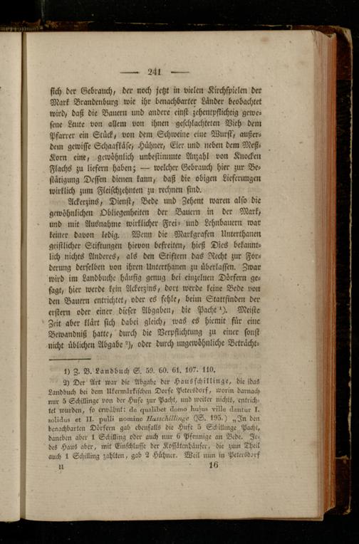 sich der Gebrauch, der noch jetzt in vielen Kirchspielen der Mark Brandenburg wie ihr benachbarter Länder beobachtet wird, daß die Bauern und andere einst zehentpflichtig gewesene Leute von allem von ihnen geschlachteten Vieh dem Pfarrer ein Stück, von dem Schweine eine Wurst, außerdem gewisse Schaafkäse, Hühner, Eier und neben dem Meß- Korn eine, gewöhnlich unbestimmte Anzahl von Knocken Flachs zu liefern haben; — welcher Gebrauch hier zur Bestätigung Dessen dienen kann, daß die obigen Lieferungen wirklich zum Flcifchzehnten zu rechnen sind.