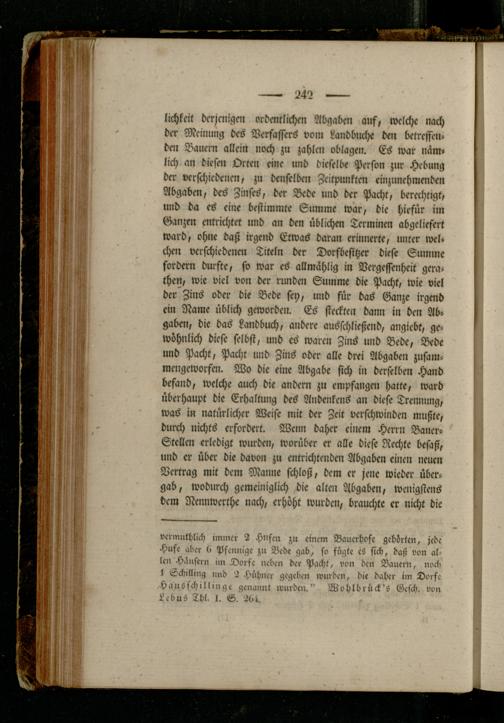 lichkeit derjenigen ordmtlichcn Abgaben auf, welche nach der Meinung des Verfassers vom Landbliche den betreffenden Bauern allein noch zu zahlen oblagen. Es war näm» lieh an diesen Orten eine und dieselbe Person zur Hebung der verschiedenen, zu denselben Zeitpunkten einzunchmenden Abgaben, des Zinses, der Bede und der Pacht, berechtigt, und da es eine bestimmte Summe war, die hirfür im Ganzen entrichtet und an den üblichen Terminen abgeliefert ward, ohne daß irgend Etwas daran erinnerte, unter wel« chen verschiedenen Titeln der Dorfbesitzer diese Summe fordern durfte, so war es allmählig in Vergessenheit gera« then, wie viel von der runden Summe die Pacht, wie viel der Zins oder die Bede sey, und für bas Ganze irgend ein Name üblich geworden. Es steckten dann in den Abgaben, die das Landbuch, andere ausschließend, angicbt, gewöhnlich diese selbst, und es waren Zins und Bede, Bede und Pacht, Pacht und Zins oder alle drei Abgaben zufam- mcngeworfen. Wo die eine Abgabe sich in derselben Hand befand, welche auch die andern zu empfangen hatte, ward überhaupt die Erhaltung des Andenkens an diese Trennung, was in natürlicher Weise mit der Zeit verschwinden mußte, durch nichts erfordert. Wenn daher einem Herrn Bauer- Stellen erledigt wurden, worüber er alle diese Rechte besaß, und er über die davon zu entrichtenden Abgaben einen neuen Vertrag mit dem Manne schloß, dem er jene wieder übergab, wodurch gemeiniglich die alten Abgaben, wenigstens dem Nennwerthe nach, erhöht wurden, brauchte er nicht die
