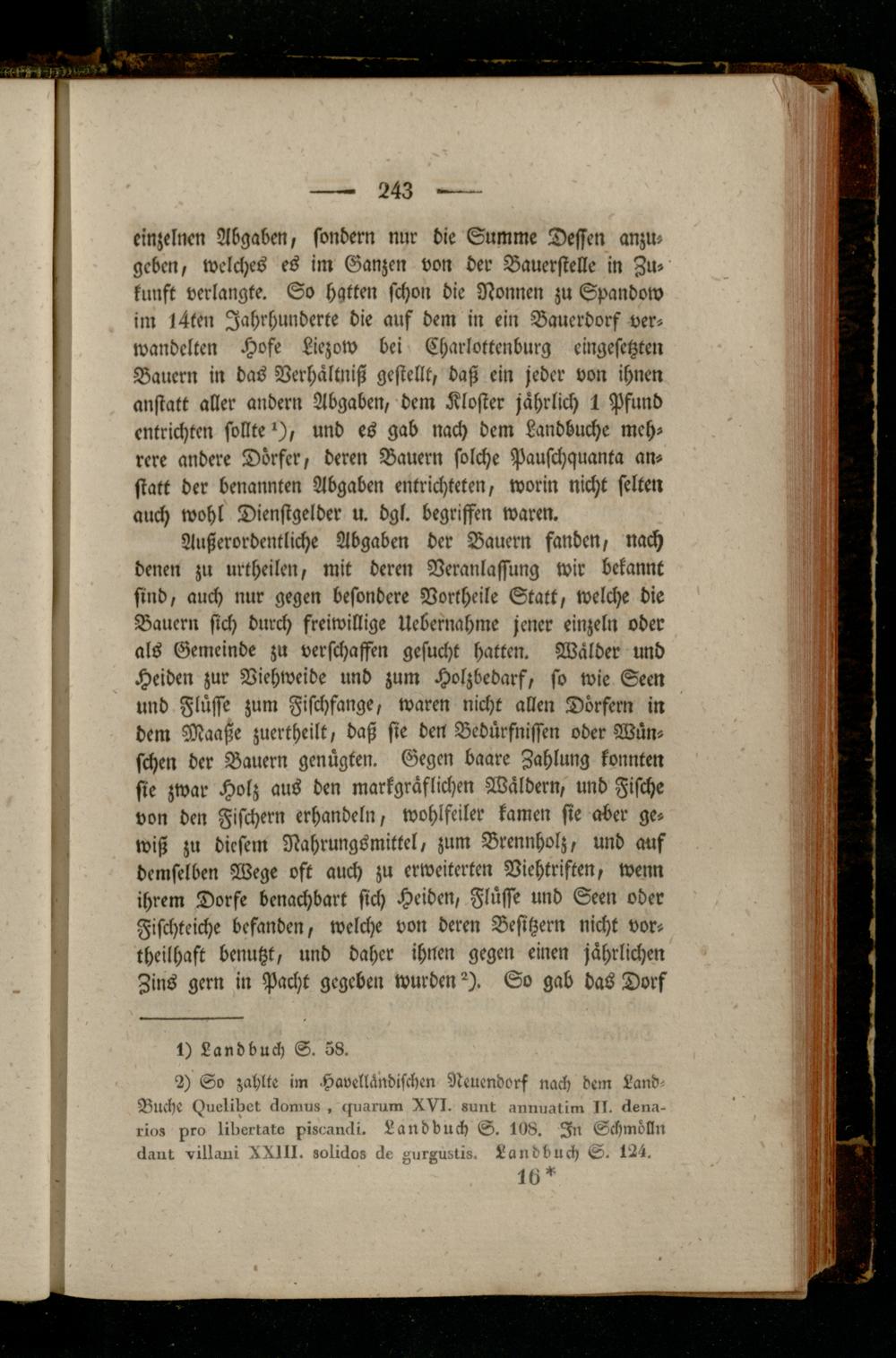 einzelnen Abgaben, sondern nnr die Summe Dessen anzu- geben, welches es im Ganzen von der Bauerstelle in Zu» kunft verlangte. So hatten schon die Nonnen zu Spandow im l4te» Jahrhunderte die auf dem in ein Baucrdorf verwandelten Hofe Liezow bei Charlottcnburg eingesetzten Bauern in das Verhältnis! gestellt, daß ein jeder von ihnen anstatt aller andern Abgaben, dem Kloster jährlich 1 Pfund entrichten sollte'), und es gab nach dem Landbuche mehrere andere Dörfer, deren Bauern solche Pauschquanta anstatt der benannten Abgaben entrichteten, worin nicht selten auch wohl Dienstgelder u. dgl. begriffen waren.