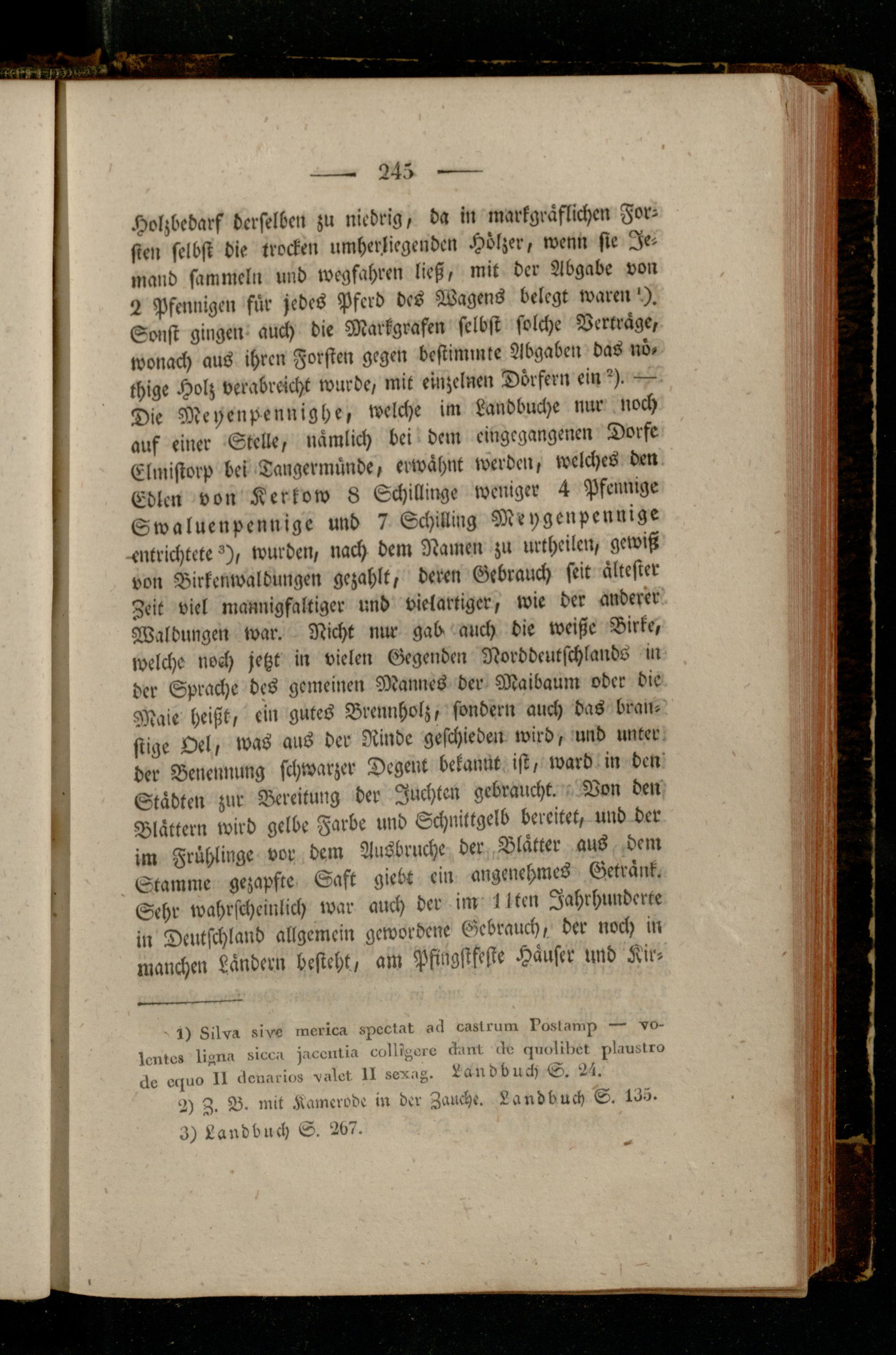 Holzbebarf derselben zu niedrig, da in markgräflichcn Forsten selbst die trocken umherliegendcn Hölzer, wenn sie Jemand sammeln und wegfahren ließ, mit der Abgabe von 2 Pfennigen für jedes Pferd des Wagens belegt waren'). Sonst gingen auch die Markgrafen selbst solche Verträge, wonach aus ihren Forsten gegen bestimmte Abgaben das nö» thige Hol; verabreicht wurde, mit einzelnen Dörfern ein — Die Meyenpennighe, welche im Landbuche nur noch auf einer Stelle, nämlich bei dem cingcgangencn Dorfe Elmistorp bei Tangermünde, erwähnt werden, welches dm Edlen von Kerkow 8 Schillinge weniger 4 Pfennige Swaluenpennigc und 7 Schilling Meygenpennige -entrichtete ^), wurden, nach dem Namen zu urtheilcn, gewiß von Birkenwaldungen gezahlt, deren Gebrauch seit ältester Zeit viel mannigfaltiger und vielartiger, wie der anderer Waldungen war. Nicht nur gab auch die weiße Birke, welche noch jetzt in vielen Gegenden Norddeutschlands in der Sprache des gemeinen Mannes der Maibaum oder die Maie heißt, ei» gutes Brennholz, sondern auch das bran- siige Oel, was aus der Rinde geschieden wird, und unter der Benennung schwarzer Dcgent bekannt ist, ward in den Städten zur Bereitung der Juchten gebraucht. Von den Blättern wird gelbe Farbe und Schnittgelb bereitet, und der im Frühlings vor dem Ausbruche der Blätter aus dem Stamme gezapfte Saft giebt ein angenehmes Getränk. Sehr wahrscheinlich war auch der im l lten Jahrhunderte in Deutschland allgemein gewordene Gebrauch, der noch in manchen Ländern besteht, am Pfiugstfeste Hauser und Kir-