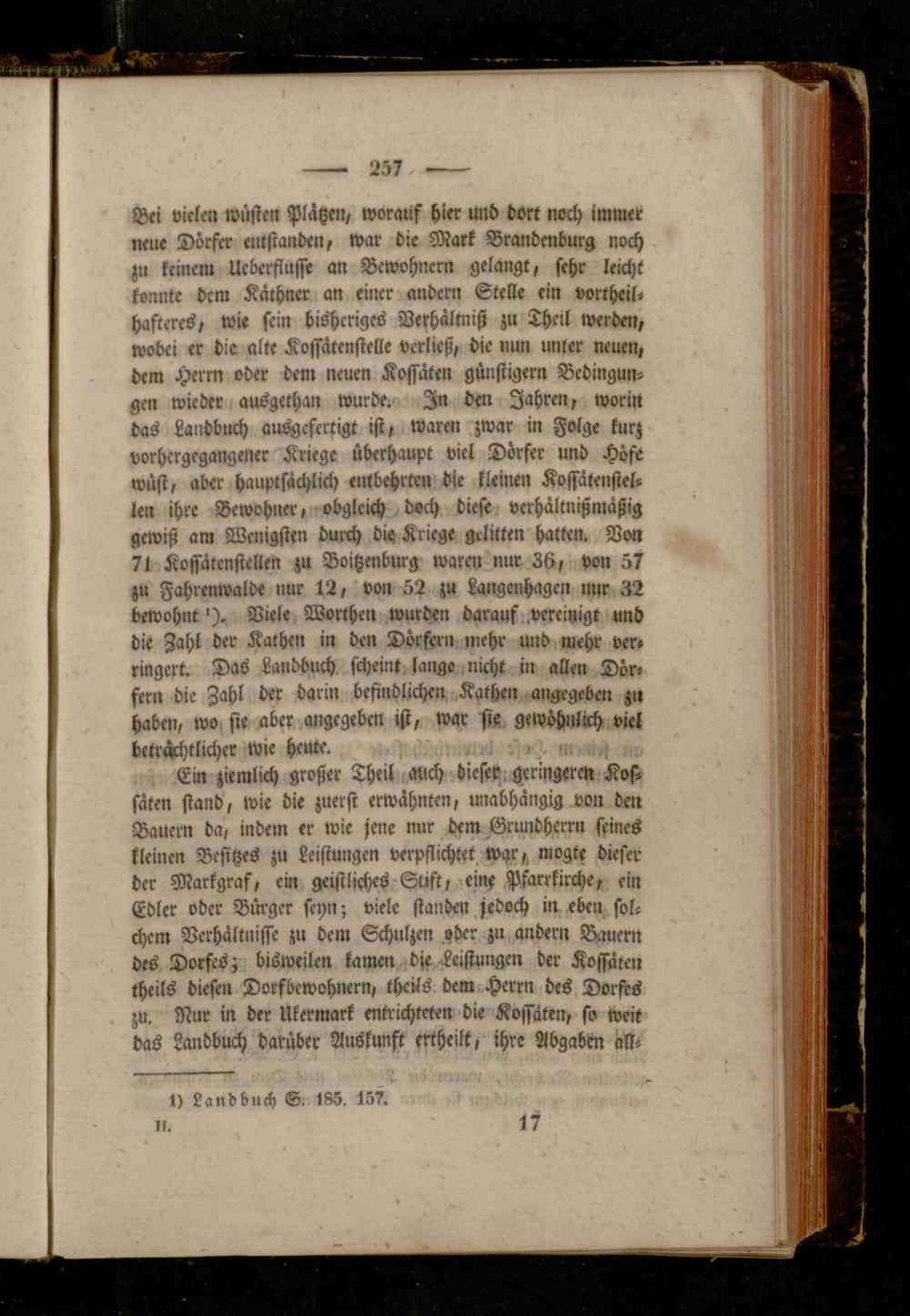 Ein ziemlich großer Theil auch dieser, geringeren Kossäten stand, wie die zuerst erwähnten, unabhängig von den Bauern da, indem er wie jene nur dem Grundherrn feines kleinen Besitzes zu Leistungen verpflichtet wgr, mogte dieser der Markgraf, ein geistliches Stift, eine Pfarrkirche, ein Edler oder Bürger scyn; viele standen jedoch in eben solchem Verhältnisse zu dem Schulzen »der zu andern Bauern des Dorfes; bisweilen kamen dje Leistungen der Kossäten theils diesen Dorfbewohnern, theils dem Herrn des Dorfes zu. Nur in der Ukermark entrichteten die Kossäten, so weit das Landbuch darüber Auskunft ettheilt, ihre Abgaben all-