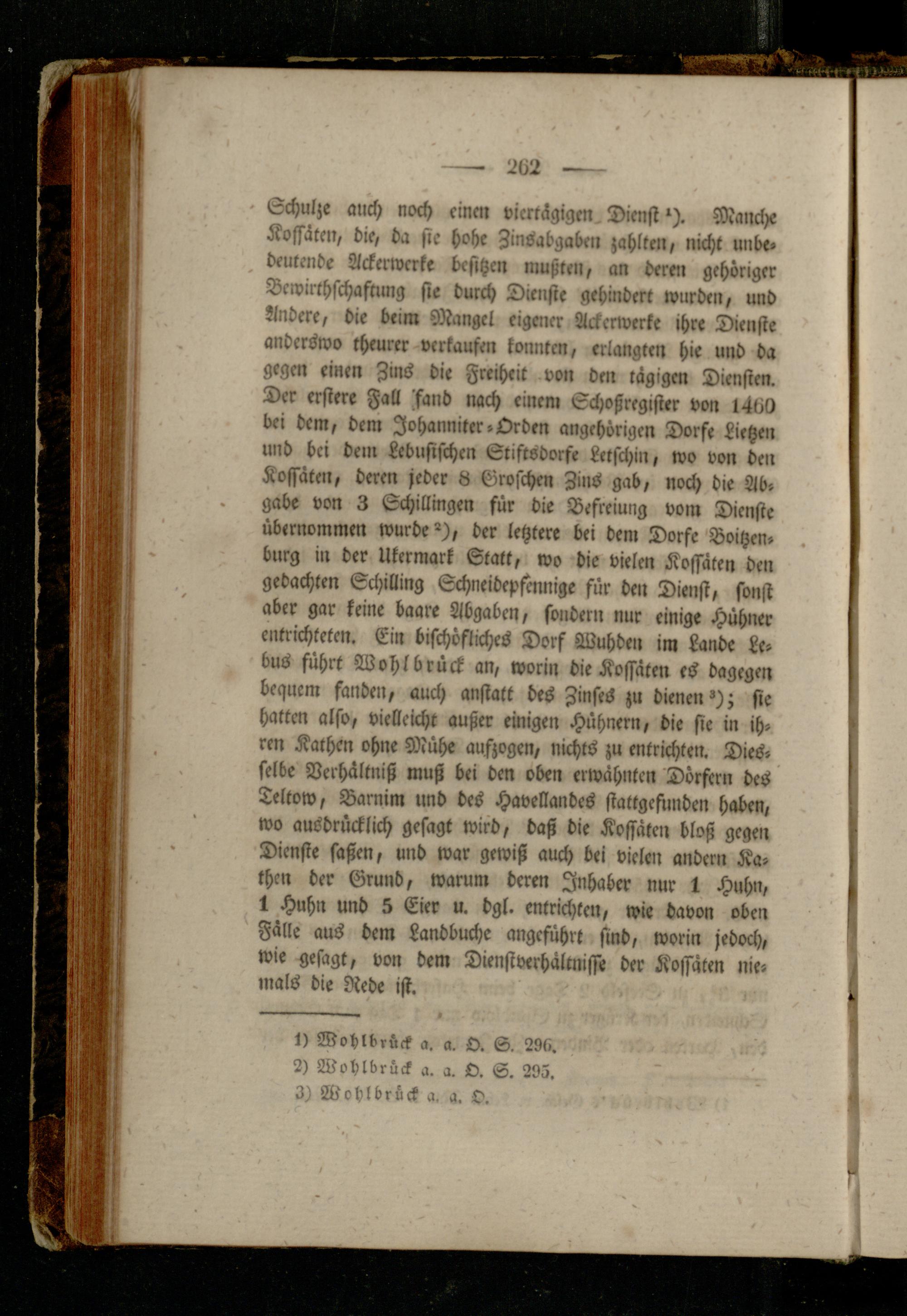 Schulze auch noch eine» viertägigen Dienst*). Mancl-e Kossäten, die, da sic hohe Zinsabgaben zahlten, nicht und«, deutende Ackerwcrke besitzen mußten, an deren gehöriger Bcwirthfchafnmg sie durch Dienste gehindert wurde», und Andere, die beim Mangel eigener Ackcrwerke ihre Dienste anderswo theurer verkaufen konnten, erlangten hie und da gegen einen Zins die Freiheit von den tägigen Diensten. Der erstere Fall 'fand nach einem Cchoßregister von 1400 bei dem, dem Johanniter-Orden angehörigen Dorfe Liehen und bei den: Lebusischen Ctiftsdorfe Letschin, wo von den Kossäten, deren jeder 8 Groschen ZinS gab, noch die Abgabe von 3 Schillingen für die Befreiung vom Dienste übernommen wurdet, der letztere bei dem Dorfe Boitzen- burg in der Ukermark Statt, wo die vielen Kossäten den gedachten Schilling Schiieidepfcnnige für den Dienst, sonst aber gar keine baare Abgaben, sondern nur einige Hühner entrichteten. Ein bischöfliches Dorf Wuhden im Lande Le- bus führt Wohl brück an, worin die Kossäten es dagegen bequem fanden, auch anstatt des ZinseS zu dienen'); sie hatten also, vielleicht außer einigen Hühnern, die sie in ihren Kathen ohne Mühe aufzvgen, nichts zu entrichten. Dies« selbe Verhältniß muß bei den oben erwähnten Dörfern des Teltow, Barnim und des Havellanbes stattgefunden haben, wo ausdrücklich gesagt wird, baß die Kossäten bloß gegen Dienste faßen, und war gewiß auch bei vielen andern Kathen der Grund, warum deren Inhaber nur 1 Huhu, 1 Huhn und 5 Eier u. bgl- entrichten, wie davon oben Fälle aus dem Landbuche angeführt sind, worin jedock), wie gesagt, von dem Dienstverhältnisse der Kossäten niemals die Rede ist.