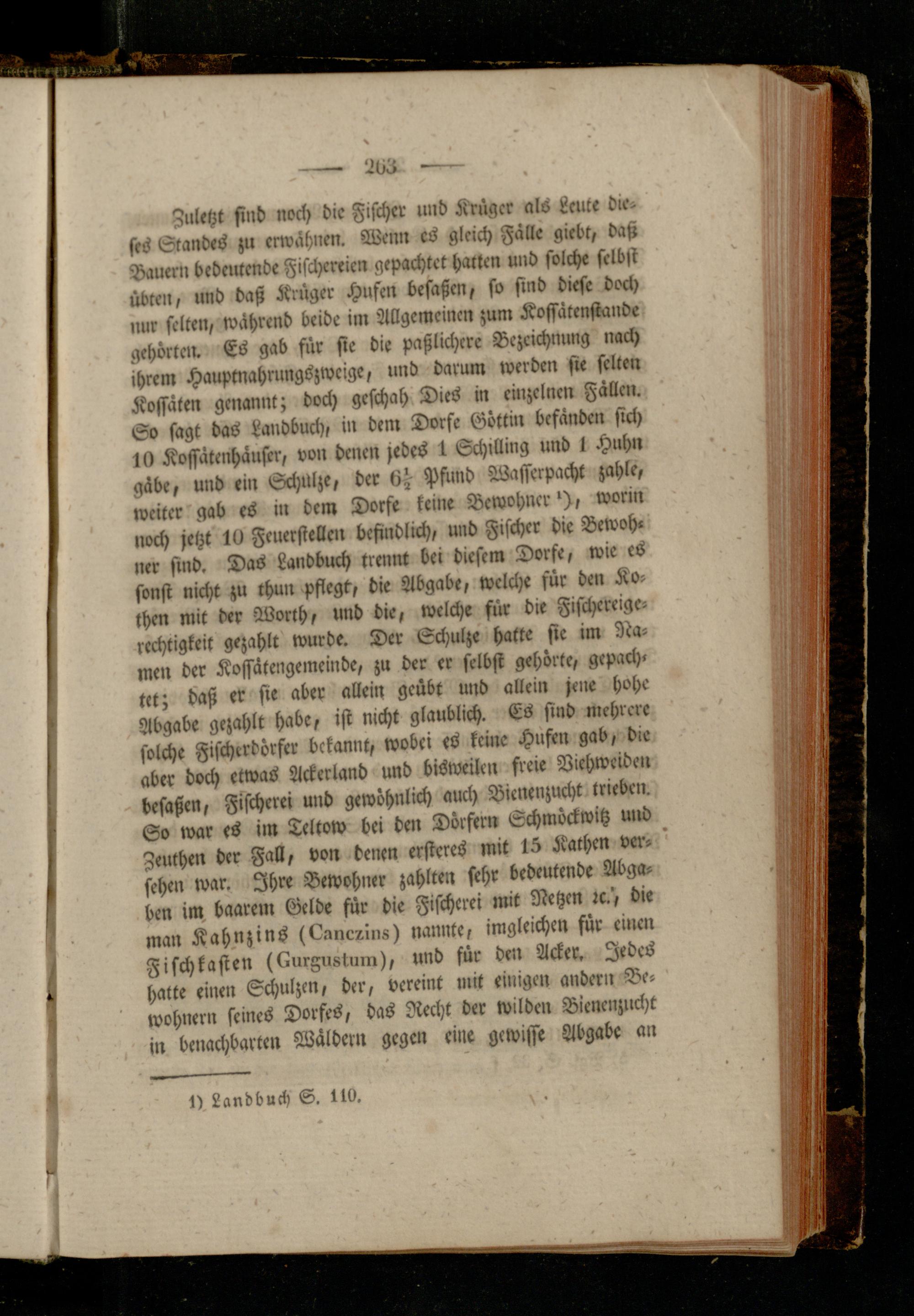 Zuletzt sind noch die Fischer und Krüger als Leut« dieses Standes zu erwähnen. Wenn cs gleich Fälle giebt, daß Bauern bedeutende Fischereien gepachtet hatten und solche selbst übten, »nid daß Klüger Hufen besaßen, so sind diese doch nur selten, während beide im Allgemeinen zum Koffätenstande gehörten. Es gab für sie die paßlichcre Bezeichnung nach ihren» Haupmahrungszwcige, und darum werden sie selten Kossäten genannt; doch geschah Dies in einzelnen Fällen. So sagt das Landbuch, in dem Dorfe Göttin befänden sich 10 Kossätenhauscr, von denen zedcs 1 Schilling und 1 Huhn gäbe, und ein Schulze, der 6^ Pfund Wasserpacht zahle, weiter gab es in dem Dorfe keine Bewohner'), worin noch jetzt 10 Feuerstellcn befindlich, und Fischer die Bewoh« „er sind. Das Landbuch trennt bei diesem Dorfe, wie es sonst nicht zu thun pflegt, die Abgabe, welche für den Kothen mit der Worth, und die, welche für die Fischcreige- rechtigkeit gezahlt wurde. Der Schulze hatte sie im Namen der Kossätengemeinde, zu der er selbst gehörte, gepachtet; daß er sie aber allein geübt und allein jene hohe Abgabe gezahlt habe, ist nicht glaublich. Es sind mehrere solche Fischerdörfer bekannt, wobei es keine Hufen gab, die aber doch etwas Ackerland und bisweilen freie Viehweide»» besaßen, Fischerei und gewöhnlich auch Bienenzucht trieben. So »var es iin Teltow bei den Dörfern Schmöckwitz und . Zeuthen der Fall, von denen ersteres mit 15 Kathen versehen »var. Ihre Bewohner zahlten sehr bedeutende Abgaben im baarem Gelbe für die Fischerei mit Netzen rc.', die man Kahn;ins (e.incrms) nannte, imgleichen für einen Fischkasten (LurFnstmii), und für deir Acker. Jedes hatte einen Schulzen, der, vereint mit einigen andern Bewohnern seines Dorfes, das Recht der wilden Bienenzucht in benachbarten Wäldern gegen eine gewisse Abgabe an