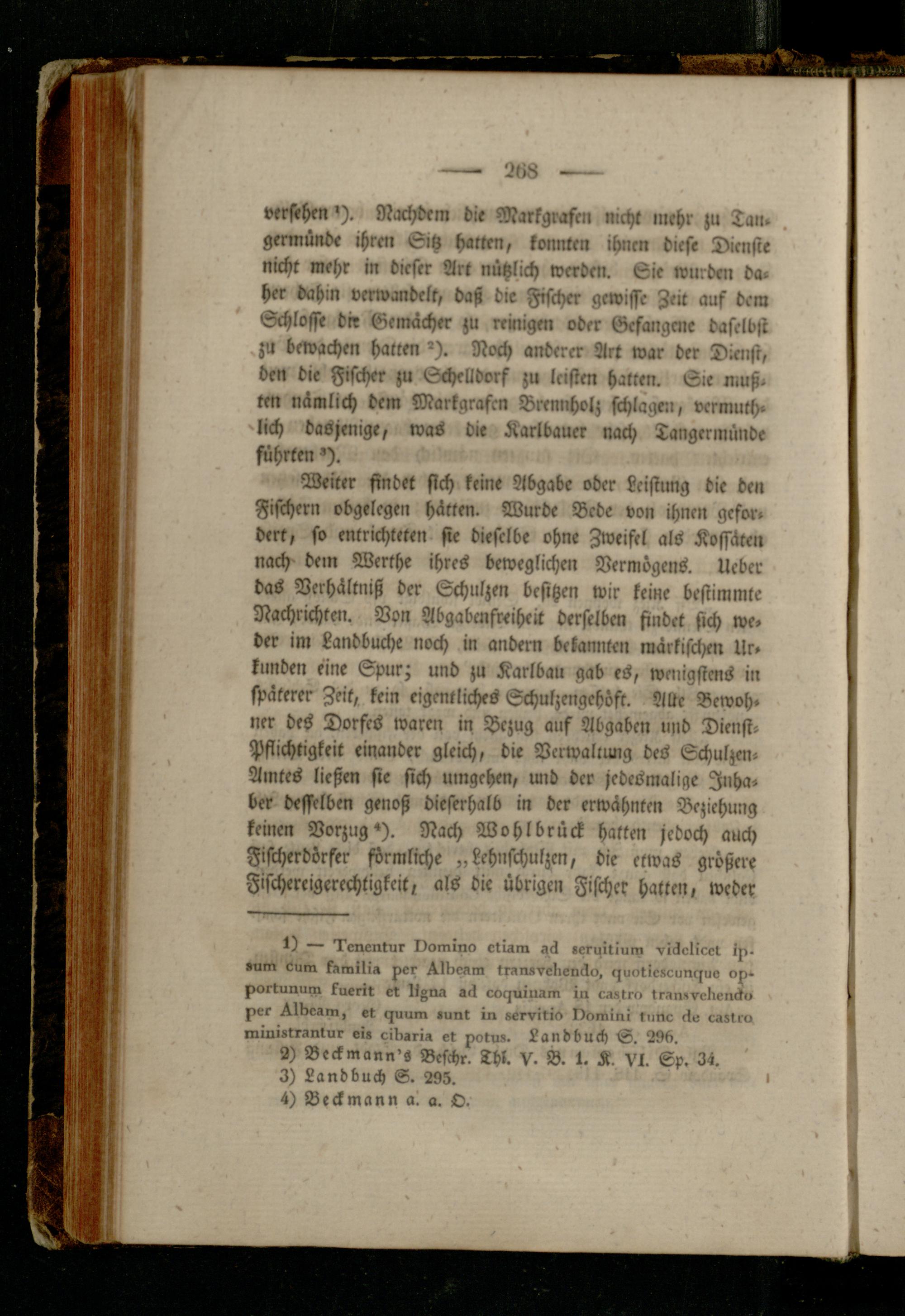 Weiter findet sich keine Abgabe oder Leistung die den Fischern vbgelegeir hätten. Wurde Bede von ihnen gefordert, so entrichteten sie dieselbe ohne Zweifel als Kossäten nach dein Werthe ihres beweglichen Vermögens, lieber das Verhältniß der Schulzen besitzen wir keine bestimmte Nachrichten. Von Abgabcnfreiheit derselben findet sich weder im Landbuche noch in andern bekannten märkisci-en Urkunden eine Spur; und zu Karlbau gab es, wenigstens in späterer Zeit, kein eigentliches Schulzengehöft. Alte Bewoh. ner des Dorfes waren in Bezug auf Abgaben lind Dienst- Pflichtigkeit einander gleich, die Verwaltung des Schulzen- Amtes ließen sie sich umgehen, und der jedesmalige Inhaber desselben genoß dieserhalb in der erwähnten Beziehung keinen Vorzug*). Nach Wohlbrück hatten jedoch auch Fischerdörfer förmliche „kehnschulzen, die etwas größere Fischerrigercchtigkeit, als die übrigen Fischer hatten, weder