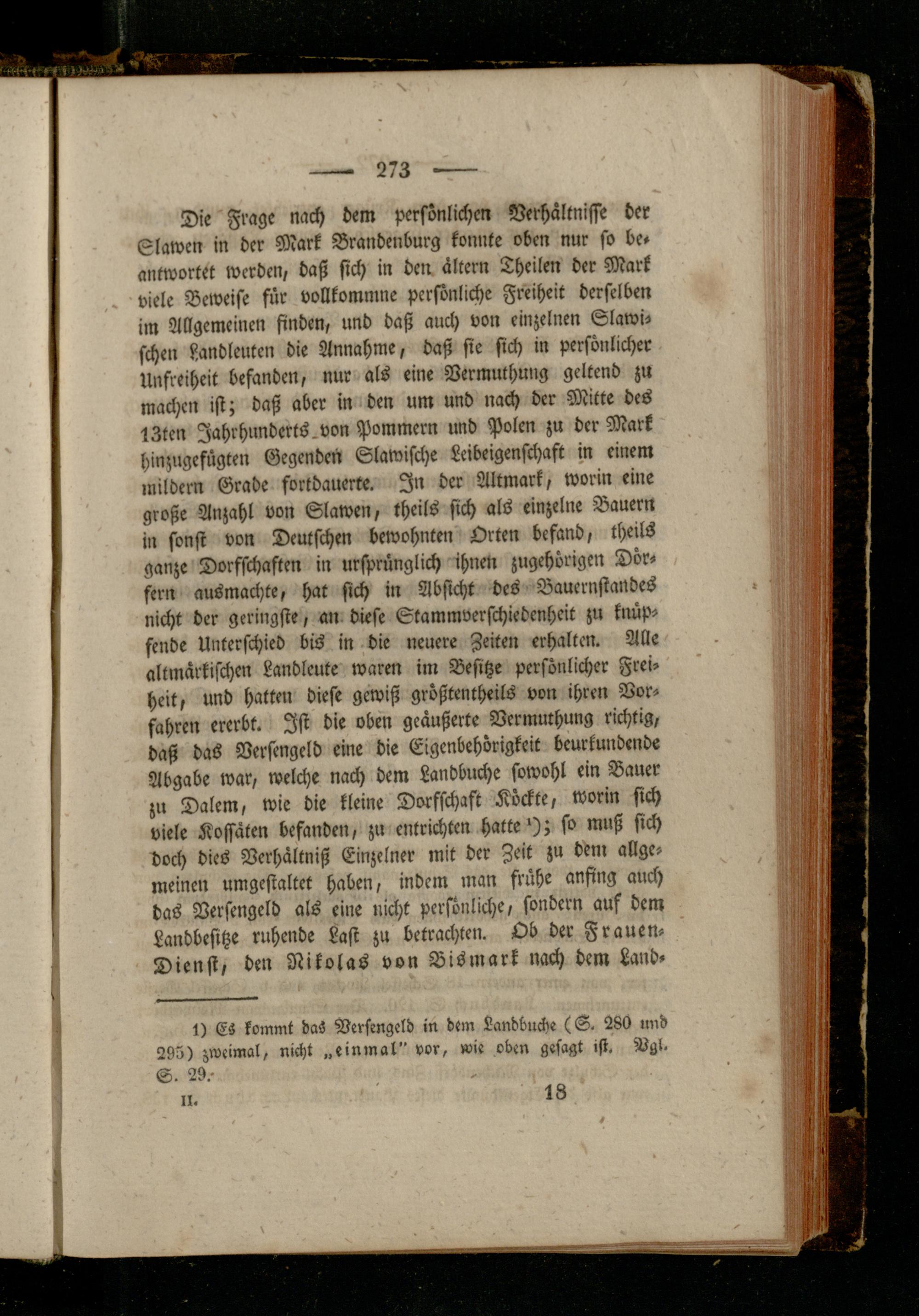 Die Frage nach dem persönlichen Verhältnisse der Slawen in der Mark Brandenburg konnte oben nur so be» antwortet werden, daß sich in den ältern Theilen der Mark viele Beweise für vollkommne persönliche Freiheit derselben im Allgemeinen finden, und daß auch von einzelnen Slawischen Landleutcn die Annahme, daß sie sich in persönlicher Unfreiheit befanden, nur als eine Vermuthung geltend zu machen ist; daß aber in den um und nach der Mitte des 13ten Jahrhunderts, von Pommern und Polen zu der Mark hinzugefügten Gegenden Slawische Leibeigenschaft in einem mildern Grade fortdauerte. In der Altmark, worin eine große Anzahl von Slawen, theils sich als einzelne Bauern in sonst von Deutschen bewohnten Orten befand, theils ganze Dorffchaften in ursprünglich ihnen zugehörigen Dörfern ausmachte, hat sich in Absicht des Bauernstandes nicht der geringste, an diese Stammverschiedenheit zu knüpfende Unterschied bis in die neuere Zeiten erhalten. Alle altmärkischen Landlcute waren im Besitze persönlicher Freiheit, und hatten diese gewiß größtenthrils von ihren Vorfahren ererbt. Ist die oben geäußerte Vermuthung richtig, daß das Verfengeld eine die Eigenbehörigkeit beurkundende Abgabe war, welche nach dem Landbuche sowohl ein Bauer zu Dalem, wie die kleine Dorfschaft Köckte, worin sich viele Kossäten befanden, zu entrichten hattet; so muß sich doch dies Verhältniß Einzelner mit der Zeit zu dem allgemeinen umgestaltet haben, indem man frühe anfing auch das Verfengeld als eine nicht persönliche, sondern auf dem Landbesitze ruhende Last zu betrachten. Ob der Frauen- Dienst, den Nikolas von Bismark nach dem Land-