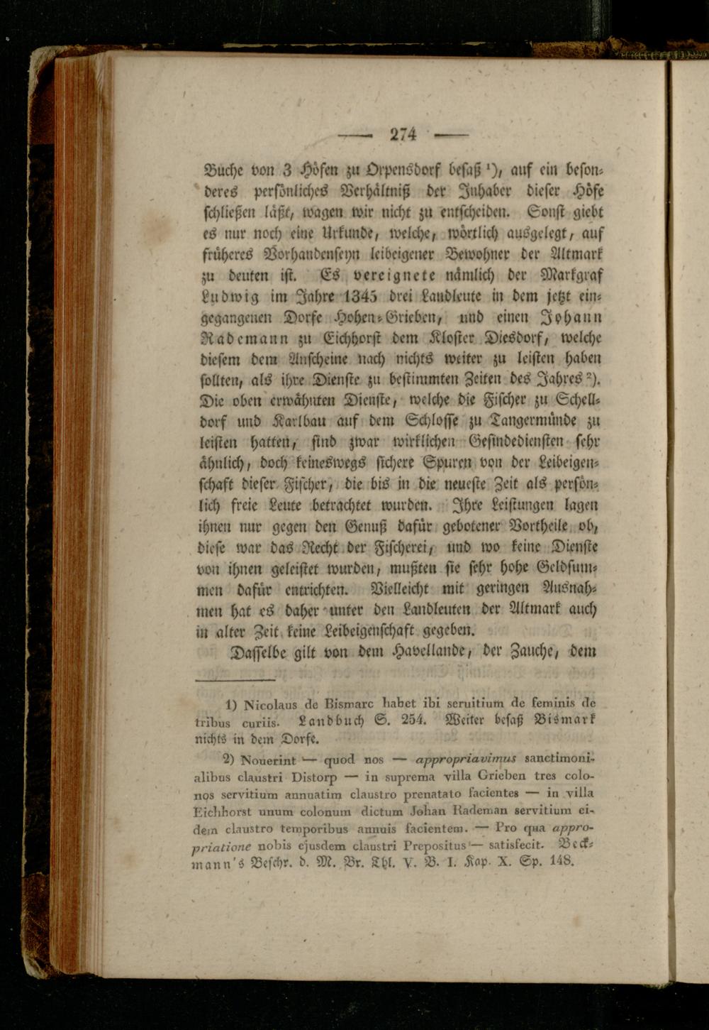Buche von Z Höfen zu Orpensdorf besaß'), auf ein besonderes persönliches Vcrhältniß der Inhaber dieser Höfe schließen laßt, wagen wir nicht zu entscheiden. Sonst giebt es nur noch eine Urkunde, welei>e, wörtlich ausgelcgt, auf früheres Vorhandenscyn leibeigener Bewohner der Altmark zu deuten ist. Es vercigncte nämlich der Markgraf Ludwig im Jahre 1345 drei Landleute in dem jetzt ein- gcgangenen Dorfe Hohen-Grieben, und einen Johann Radcmann zu Eichhorst dem Kloster Diesdorf, welche diesem dem Anscheine nach nichts weiter zu leisten haben sollten, als ihre Dienste zu bestimmten Zeiten des Jahres °). Die oben erwähnten Dienste, welche die Fischer zu Schell- dorf und Karlbau auf dem Schlosse zu Tangermünde zu leisten hatten, sind zwar wirklichen Gesindediensten sehr ähnlich, doch keineswegs sichere Spuren von der Leibeigenschaft dieser Fischer, die bis in die neueste Zeit als persönlich freie Leute betrachtet wurden. Ihre Leistungen lagen ihnen nur gegen den Genuß dafür gebotener Vortheile ob, diese war bas Recht der Fischerei, und wo keine Dienste von ihnen geleistet wurden, mußten sie sehr hohe Geldsummen dafür entrichten. Vielleicht mit geringen Ausnahmen hat es daher unter den Landleutcn der Altmark auch in alter Zeit keine Leibeigenschaft gegeben.