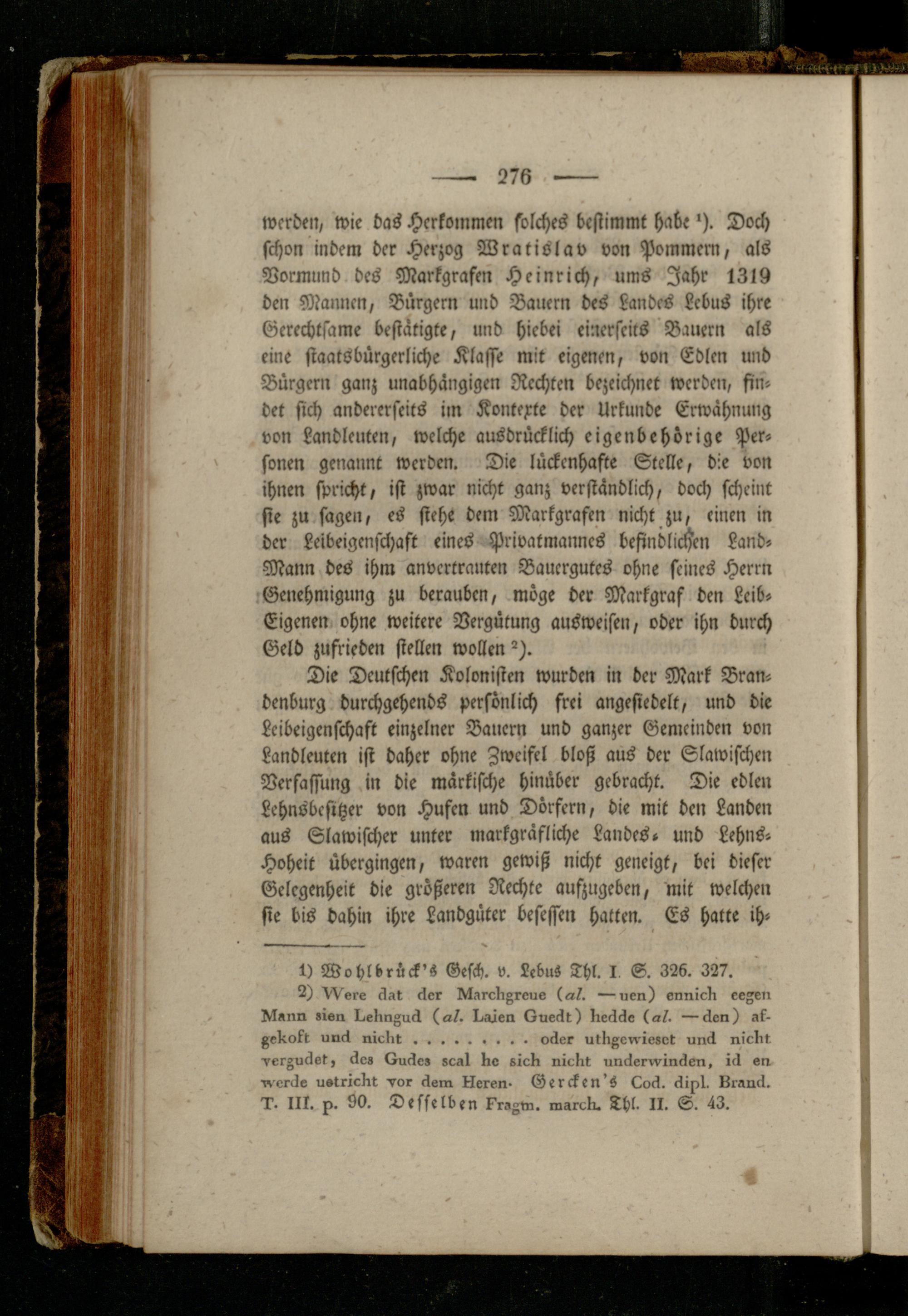 Die Deutschen Kolonisten wurden in der Mark Brandenburg durchgehends persönlich frei angesiebelt, und die Leibeigenschaft einzelner Bauern und ganzer Gemeinden von Landleuten ist daher ohne Zweifel bloß aus der Slawischen Verfassung in die märkische hinüber gebracht. Die edlen Lchnsbcsitzer von Hufen und Dörfern, die mit den Landen aus Slawischer unter markgräfliche Landes- und Lehns- Hoheit übergingen, waren gewiß nicht geneigt, bei dieser Gelegenheit die größeren Rechte aufzugeben, mit welchen sie bis dahin ihre Landgüter besessen hatten. Es hatte ih-