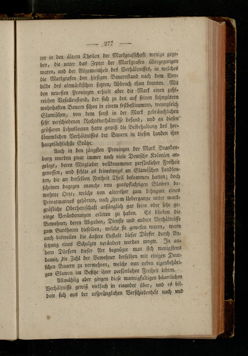 Auch in den jüngsten Provinzen der Mark Brandenburg wurden zwar immer noch viele Deutsche Kolonien angelegt, deren Mitglieder vollkommener persönlicher Freiheit genossen, und fehlte cs keineswegs an Slawischen Landleuten, die an derselben Freiheit Theil bekommen hatten; doch scheinen dagegen manche von gutspflichtigen Slawen bewohnte Orte, welche von altersher zum Lehngutc eines Privatmannes gehörten, nach Hrem Uebergange unter markgräfliche Oberherrschaft anfänglich gar keine oder sehr geringe Veränderungen erlitten zu haben. Es blieben die Bewohner, deren Abgaben, Dienste und andere Verhältnisse zum Gutsherrn dieselben, welche sie gewesen waren, wenn auch bisweilen die äußere Gestalt dieser Dörfer durch Ansetzung eines Schulzen verändert werden mogte. In andern Dörfern dieser Art begnügte man sich wenigstens damit, />ie Zahl der Bewohner derselben mit einigen Deutschen Bauern zu vermehren, welche nun neben eigenbehöri« gen Slawen im Besitze ihrer persönlichen Freiheit lebten.