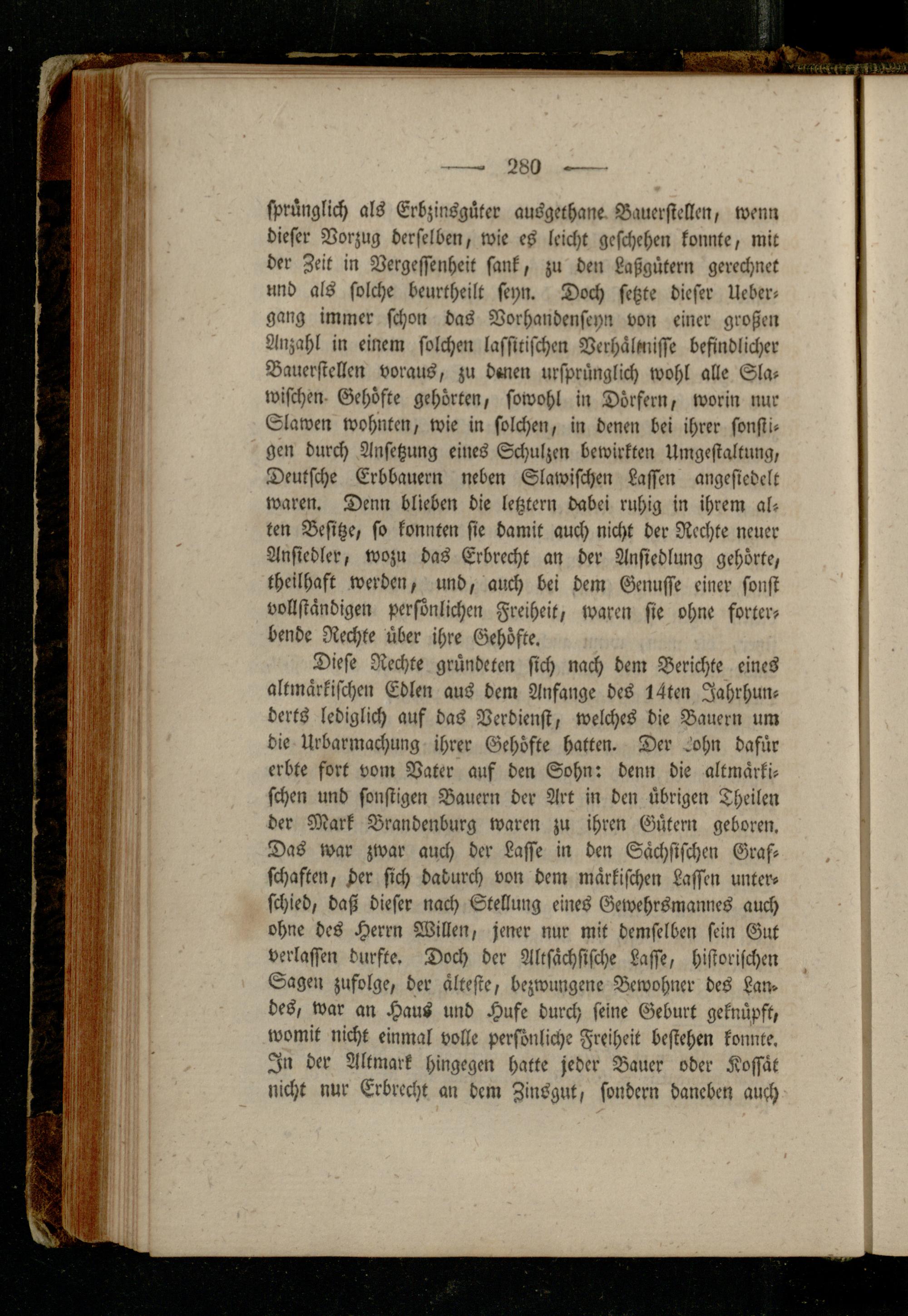 sprünglich als Erbzinsgüter ausgethane. Bauerstellen, wenn dieser Vorzug derselben, wie cs leicht geschehen konnte, mit der Feit in Vergessenheit sank, zu den Laßgütern gerechnet und als solche beurtheilt sepn. Doch setzte dieser Ucber- gang immer schon das Vorhandenst,)» von einer großen Anzahl in einem solchen lassitischcn Verhältnisse befindlicher Bauerstellen voraus, zu drnen ursprünglich wohl alle Slawischen Gehöfte gehörten, sowohl in Dörfern, worin nur Slawen wohnten, wie in solchen, in denen bei ihrer sonstigen durch Ansetzung eines Schulzen bewirkten Umgestaltung, Deutsche Erbbauern neben Slawischen Lassen angesicdclt waren. Denn blieben die letzter» dabei ruhig in ihrem alten Besitze, so konnten sie damit auch nicht der Rechte neuer Ansiedler, wozu das Erbrecht an der Ansiedlung gehörte, theilhaft werden, und, auch bei dem Genüsse einer sonst vollständigen persönlichen Freiheit, waren sie ohne forterbende Rechte über ihre Gehöfte.