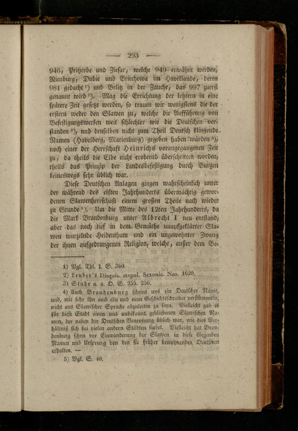 4) Auch Brandenburg scheint uns ein Deutscher Name, und, wie sehr ihn auch alte und neue Geschichtsschreiber verstümmeln, nicht aus Slawischer Sprache abzuleiten zu seyu. Vielleicht gab es für diese Stadt «inen unS unbekannt gebliebenen Slawischen Namen, der neben der Deutschen Benennung üblich war, wie dies Der- hältniß sich bei vielen andern Städten siudet, Vielleicht hat Brandenburg schon vor Einwanderung der Slawen in diese Gegenden Namen und Ursprung von den sie früher bewohnenden Deutschen erhalten. —