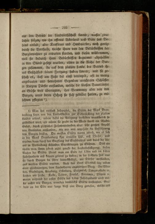 nur den Betrieb der Landwitthschaft kannte, mußte zwar dahin folgen, wo ihn offenes Ackerland mcd Güte des Bodens einlud; aber Kauflcute und Handwerker, noch gereizt durch die Dorkheile, welche ihnen von den Bedürfnissen der Burgbewohner zu erwarten standen, und diesen willkommen, weil sie dadurch ihren Bedürfnissen bequemer abzuhelfen in den Stand gesetzt würden, eilten in die Nahe der Burgen zusammen, da auf dem platten Lande der Betrieb ihres Geschäftes keinen Fortgang haben konnte; und so geschah es, daß am Fuße der einst vereinzelt, oft in wenig angebauten und bewohnten Gegenden errichteten Schlösser in Kurzem Dörfer entstanden, welche die bloßen Bauerdörfer an Größe weit überragten, ihre Benennung aber von den Burgen, unter deren Schutz sie sich gebildet hatten, zu entlehnen pflegten