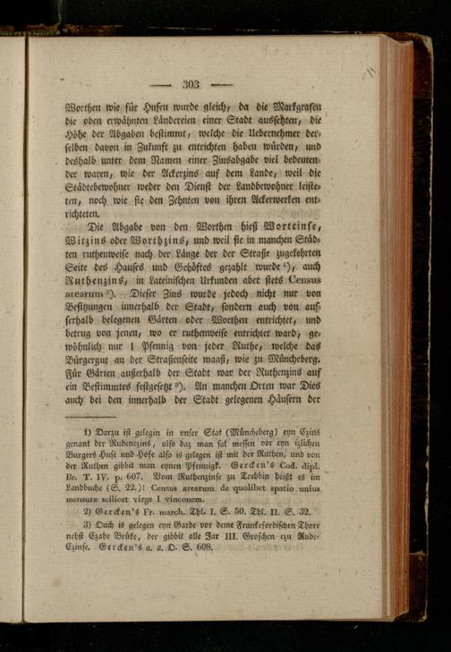 Die Abgabe von den Worthen hieß Wortcinse, Witzins oder Worthzins, und weil sie in manchen Städten ruthenweife nach der Länge der der Straße zugekehrten Seite des Hauses und Gehöftes gezahlt wurde*), auch Ruthenzins, in Lateinischen Urkunden aber stets 6en8ri8 r,ro.irum ^). Dieser Zins wurde jedoch nicht nur von Besitzungen innerhalb der Stadt, sondern auch von auf scrhalb belegenen Gärten oder Worthen entrichtet, und betrug von jenen, wo er ruthenweise entrichtet ward, gewöhnlich nur 1 Pfennig von jeder Ruthe, welche das Dürgergut an der Straßenseite maaß, wie zu Müncheberg. Für Gärten außerhalb der Stadt war der Ruthcnzins auf ein Bestimmtes festgesetzt ^). An manchen Orten war Dies auch bei den innerhalb der Stadt gelegenen Hausern der