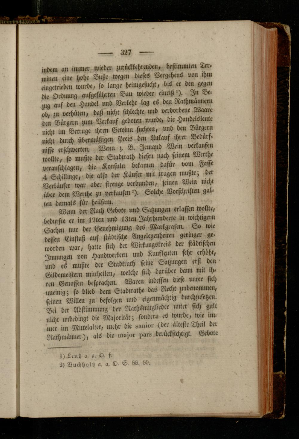 Wenn der Rath Gebote und Satzungen erlassen wollte, bedurfte er im 12tcn und IZten Jahrhunderte in wichtigem Saci-en nur der Genehmigung des Markgrafen. So wie dessen Einfluß auf städtische Angelegenheiten geringer geworden war, hatte sich der Wirkungskreis der städtischen Innungen von Handwerkern und Kauflenten sehr erhöht, und es mußte der Stadtrath seine Satzungen erst den Gildemeisiern mitthcilen, welche sich darüber dann mit ihren Genossen besprachen. Waren indessen diese unter sich uneinig; so blieb dem Stadtrathe das Recht Unbenommen, seinen Willen zu befolgen und eigenmächtig durchzusetzcn. Bei der Abstimmung der Rathsmitgliedcr unter sich galt nicht unbedingt die Majorität; sondern es wurde, wie im> mer im Mittelalter, mehr die i-uiiior (der älteste Theil der Rathmännrr), als die wojor pars berücksichtigt. Gebote