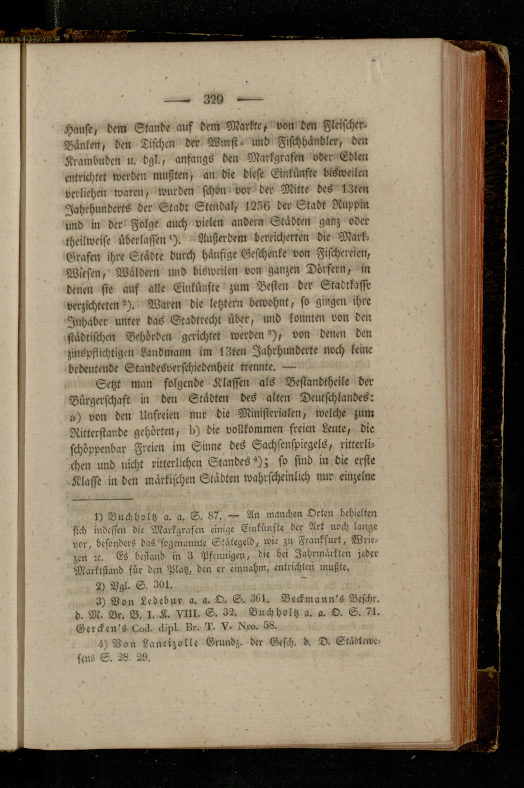 1) Buchholtz a. a. S. 87. — An manchen Orten behielten sich indessen die Markgrafen einige Einkünfte der Art noch lange vor, besonders das sogenannte Stätegeld, wie zu Frankfurt, Wrie^ zen :c. Es bestand in 3 Pfennigen, die bei Jahrmärkten jeder Marktstand für den Platz, den er cinnahm, entrichten mußte,