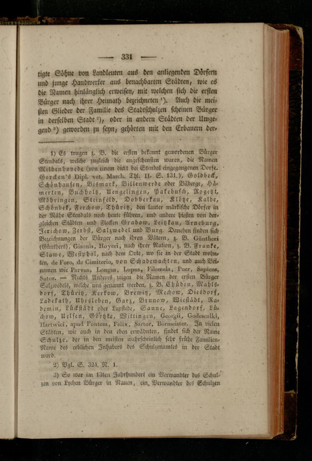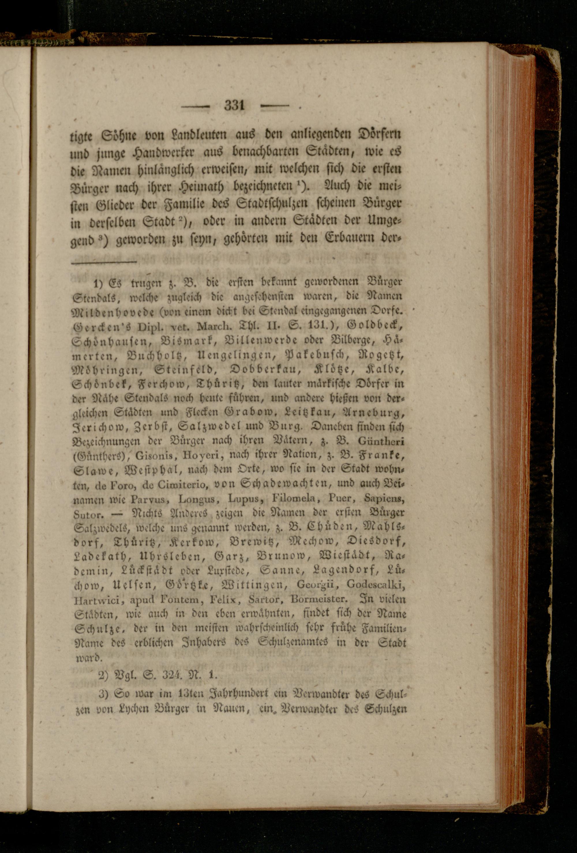 1) Cr trugen B. die ersten bekannt gewordenen Bürger Stendals, welche zugleich die angesehensten waren, die Namen Mildenhoved« (von einem dicht bei Stendal eingeganzenen Dorfe. Gercken's Uiz>l. vet. däsrcli. Thl. II. S. 131.), Goldbeck, Schönhausen, Bismark, Billenwerde oder Vilbergc, Hä- mcrten, Buchholtz, Uengclingen, Pakcbusch, Rogctzt, Möhringen, Steinfeld, Dobberkau, Klötze, Kalbe, Schönbek, Ferchow, Thüritz, den lauter märkische Dörfer in der Nähe Stendals noch heute führen, und andere hießen voi, dergleichen Städten und Flecken Grabow, Leitzkau, Arncburg, Ierichow, Zerbst, Salzwedel und Burg. Daneben ssnden sich Bezeichnungen der Bürger nach ihren Vätern, z. B. Lüntlii-ri (Günthers), 6isoni», Ilovori, nach ihrer Nation, z. B. Frank«, Slawe, Westphal, »ach dem Orte, wo sic in der Stadt wohnten, <>o l'oro, ckü eirvitvrio, von Schadewachten, und auch Beinamen wie karvus, l-angus, I-vpus, b'ilvmela, l?uer, Lapien», Lutvr. — Nichts Anderes zeige» die Namen der ersten Bürger SalzwedelS, welche un» genannt werden, z. B. Chüden, MahlS- dorf, Thüritz, Kcrkow, Brewitz, Mechow, DieSdorf, Ladckath, llhrSlcbcn, Garz, Brunow, Wiestädt, Ra- dcmin, Lückstädt oder Luxstede, Sanne, Lagendorf, Lüchow, Uelsen, Görtzk.c, Wiltingen, Qeurgii, Oe>3o«oaIK.i, llartvvici, a^uck l^ontcm, 1'elix, Larior, Uoriuoistcr. In vielen Städten, wie auch in den eben erwähnten, findet sich der Name Schulze, der in den meisten wahrscheinlich sehr frühe Familien- Name dcS erblichen Inhabers des SchulzenamteS in der Stadt ward.