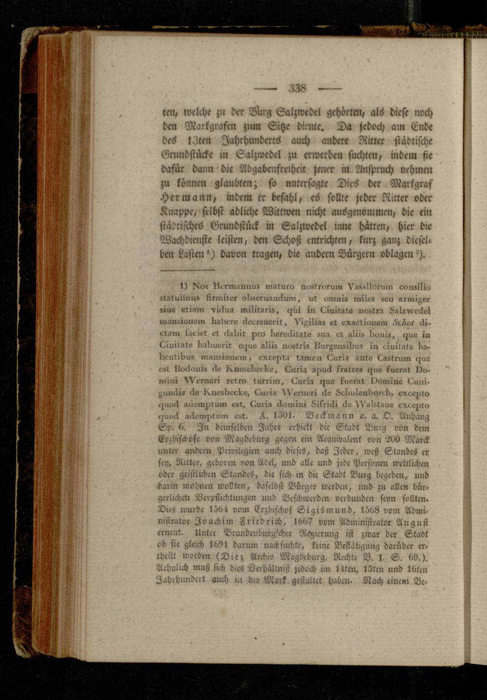 teil, welche zu der Burg Salzwedel gehörten/ als diese noch den Markgrafen zum Sitze diente. Da jedoch au» Ende des IZten Jahrhunderts auch andere Ritter städtische Grundstücke in Salzwedel zu erwerben suchte«/ indem sie dafür dann die Abgabrnfreiheit jener in Anspruch nehmen zu können glaubten; so untersagte Dies der Markgraf Hermann/ indem er befahl/ es sollte jeder Ritter oder Knappe, selbst adliche Wittwen nicht ausgenommen/ die ein städtisches Grundstück in Ealzwrdcl inne hätten/ hier die Wachdienste leisten / dm Schoß entrichten / kur; ganz diese!» den Lasten') davon trage»/ die andern Bürgern oblagen