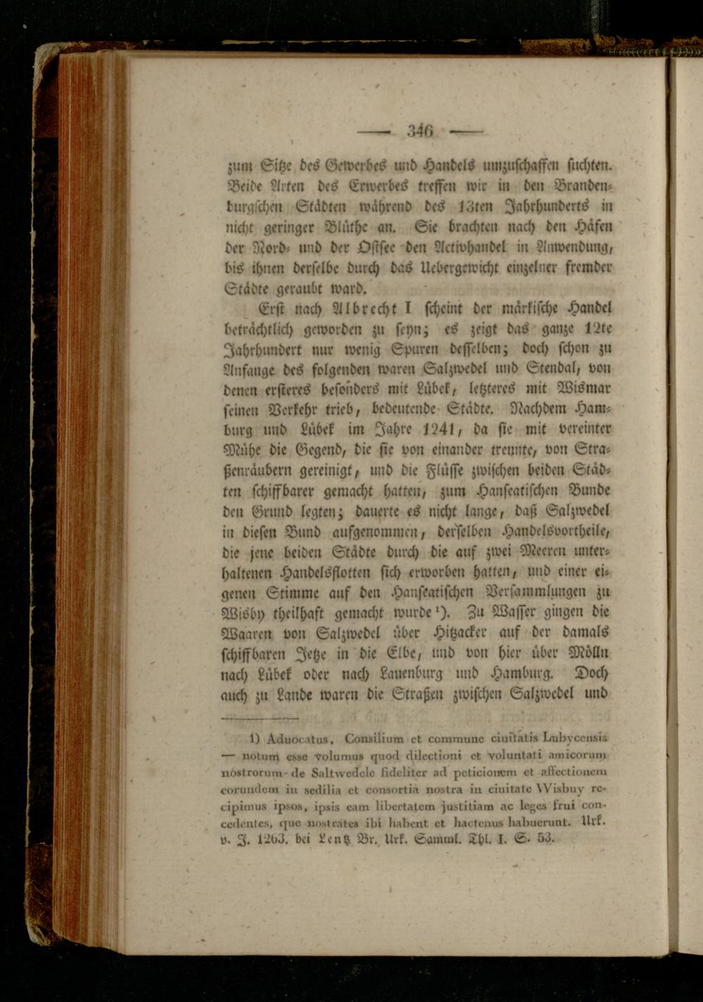 Erst nach Al brecht I scheint der märkische Handel beträchtlich geworden zu scyn; es zeigt das ganze 12te Jahrhundert nur tvenig Spuren desselben; doch schon zu Anfänge des folgenden waren Salzwedel und Stendal, von denen ersteres besonders mit Lübek, letzteres mit Wismar seinen Verkehr trieb, bedeutende Städte. Nachdem Hamburg und Lübek im Jahre 1241, da sie mit vereinter Mühe die Gegend, die sic von einander trennte, von Straßenrändern gereinigt, und die Flüsse zwischen beiden Städten schiffbarer gemacht hatten, zum Hanseatischen Bunde den Grund legten; dauerte es nicht lange, daß Salzwedel in diesen Bund ausgenommen, derselben Handelsvortheile, die jene beide» Städte durch die auf zwei Meeren unterhaltenen Handelsflotten sich erworben halten, und einer eigenen Stimme auf den Hanseatischen Versammlungen zu Wisby theilhaft gemacht wurde'). Zu Wasser gingen die Waarcn von Salzwedel über Hitzacker auf der damals schiffbaren Jetze in die Elbe, und von hier über Mölln nach Lübek oder nach Lauenburg und Hamburg. Doch auch zu Lande waren die Straßen zwischen Salzwcdel und