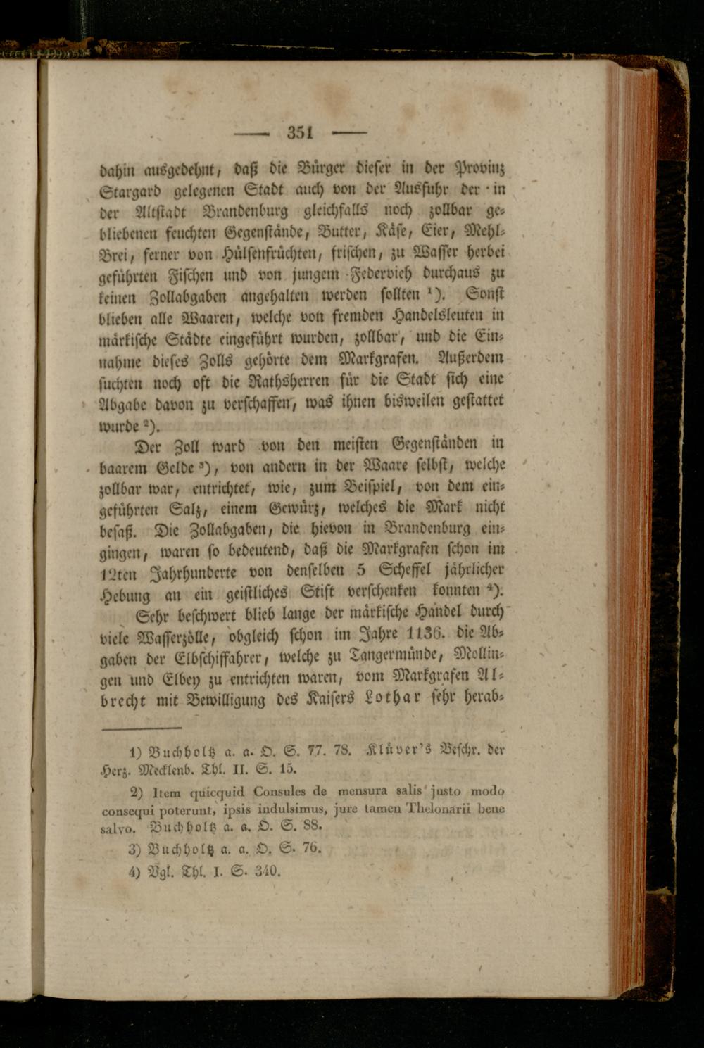 Der Zoll ward von den meisten Gegenständen in . baarcm Geldes, von andern in der Waare selbst, welche zollbar war, entrichtet, wie, zum Beispiel, von dem ein- gcführten Salz, einem Gewürz, welches die Mark nicht besaß. Die Zollabgaben, die hievon in Brandenburg ein- gingen, waren so bedeutend, daß die Markgrafen schon im lülren Jahrhunderte von denselben 5 Scheffel jährlicher Hebung an ein geistliches Stift verschenken konnten *).