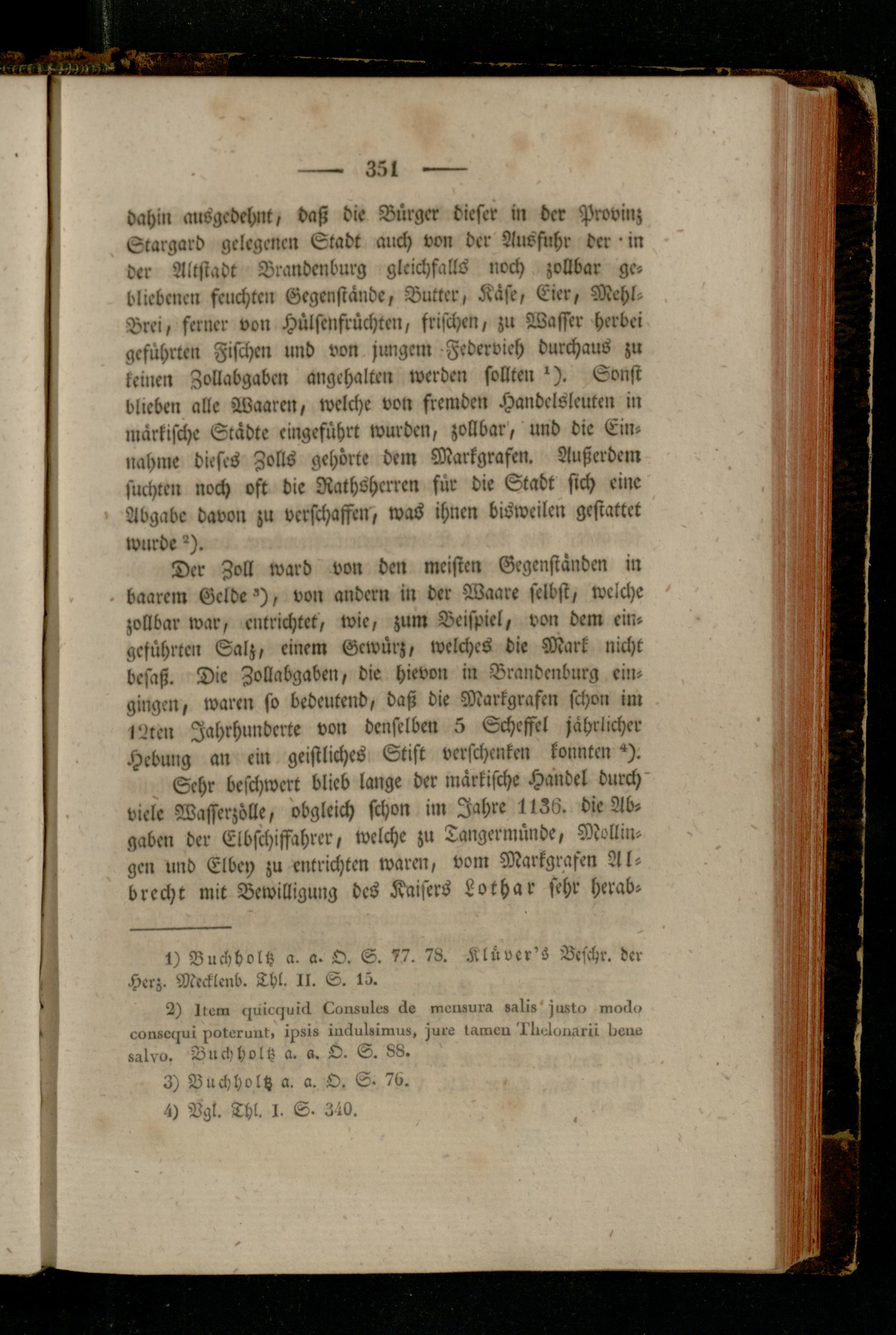 Sehr beschwert blieb lange der märkische Handel durch viele Wasserzölle, obgleich schon im Jahre 1lZ6. die Abgaben der Elbschiffahrer, welche zu Tangermünde, Möllingen und El bei) zu entrichten waren, vom Markgrafen Al- brecht mit Bewilligung des Kaisers Lothar sehr herab-