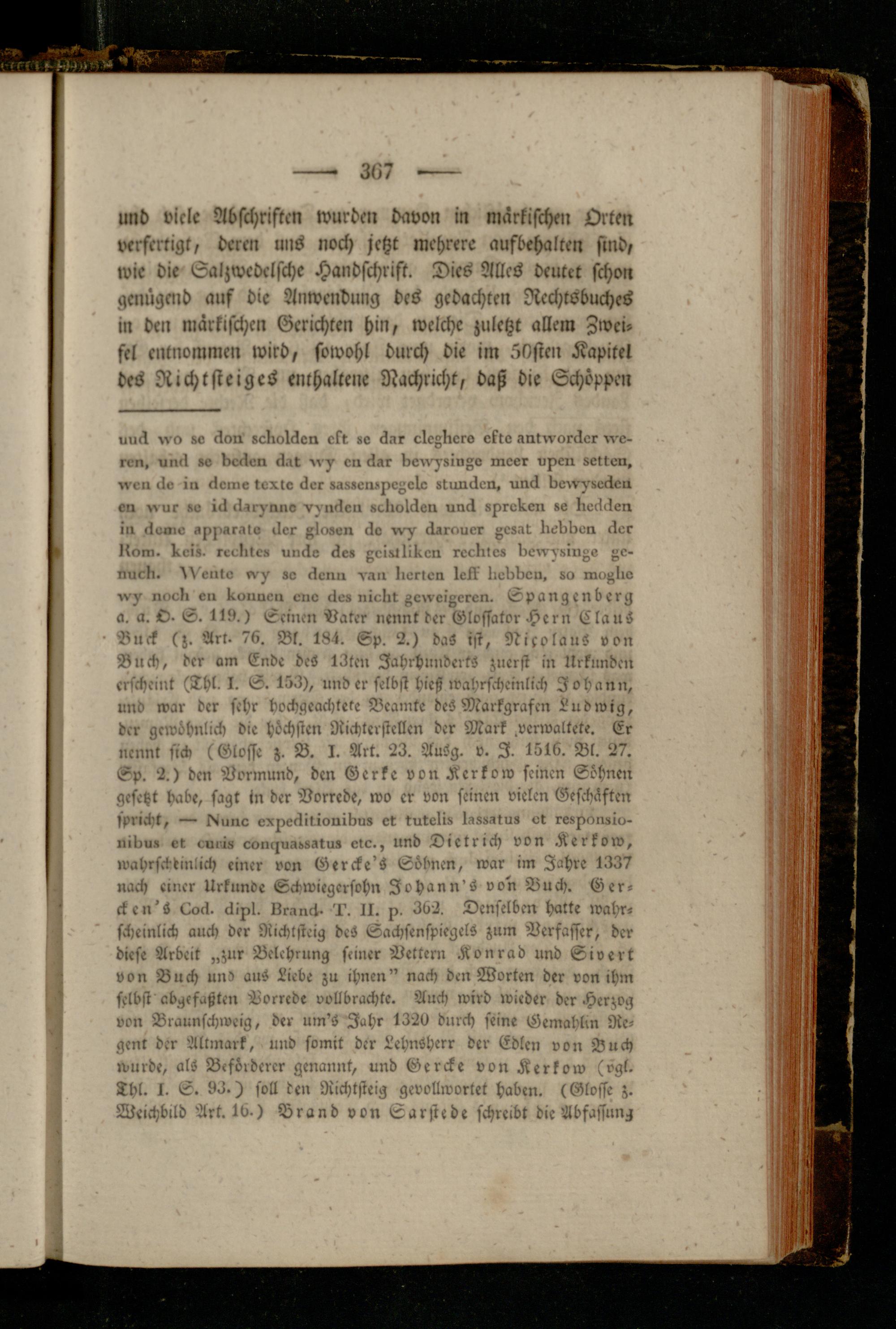 uuN iva 8« Non eckiolNon elt «o Nur cleZllero ekte anlvroräcr rve- ron, unN 80 ircNen Nat c» Nar l>evv^8ioAe nicer upen scttarr, ivcn No in Nemo texte Nor 8S88en»^egcIe atunNcn, und voiv^'seNeu en >vur 80 lN Nav) nnv vvnNen 8eIroiNen und 8^rreieon 8« IieNNen ui Nanie a^^isralo Nor ßlnaen No äarouer Aeaat Iwblien Nor Uom. llei8. reol >108 unNo Nk8 gcl8tIUren roclilc8 Ucivvsings A 0 - nucii. ^Vento >v^ 8o Non» van Iiorloil lelk Iioilbou, 80 mo^Ilo uoo?> e» Irounc» o»o Nea nielit gerveigeren. Spangen borg a. a. O- S. 1l9.) Seinen Baker nennt der Glossator Hern ClauS Buek (z. Art. 76. Bl. 184. Sp. 2.) das ist, Nikolaus von Buch, der am Ende deS 13ten Jahrhunderts zuerst in Urkunden erscheint (Thl. I. S. 163), und er selbst hieß wahrscheinlich Johann, und war der sehr hochgeachtete Beamte deS Markgrasen Ludwig, der gewöhnlich die höchsten Richterstcllen der Mark .verwaltete. Er nennt sich (Glosse z. B. I. Art. 23. AuSg. v. I. 1516. Bl. 27. Sp. 2.) den Bonn und, den Gerkc von Kcrkow seinen Söhnen gesetzt habe, sagt in der Vorrede, wo er von seinen vielen Geschäften spricht, — Henne cx^eNitionibna et tutelw lassatua et responsio- ilivuz ot ounis congu->d8atu8 orc., und Dietrich von .Rerkow, wahrscheinlich einer von Gercke's Söbnen, war im Jahre 1337 nach einer Urkunde Schwiegersohn Johanns von Buch. Gerst cn's tx>n. Nipl. LrauN- M II. p. 362. Denselben hatte wahrscheinlich auch der Richlsteig deS Sachsenspiegels zum Verfasser, der diese Arbeit „zur Belehrung seiner Vetter» Konrad und Sivert von Buch und auS Liebe zu ihnen" nach den Worten der von ihm selbst abgefaßten Vorrede vollbrachte. Auch wird wieder der Herzog von Braunschwcig, der um'S Jahr 1320 durch seine Gemahlin Regent der Allmark, und somit der Lehnsherr der Edlen von Buch wurde, als Beförderer genannt, und Gerste von Kerkow (vgl. Thl. I. E. 93.) soll den Richtsteig gevollworlet haben. (Glosse z. Weichbild Art. 16 ) Brand von Earstede schreibt die Abfassung