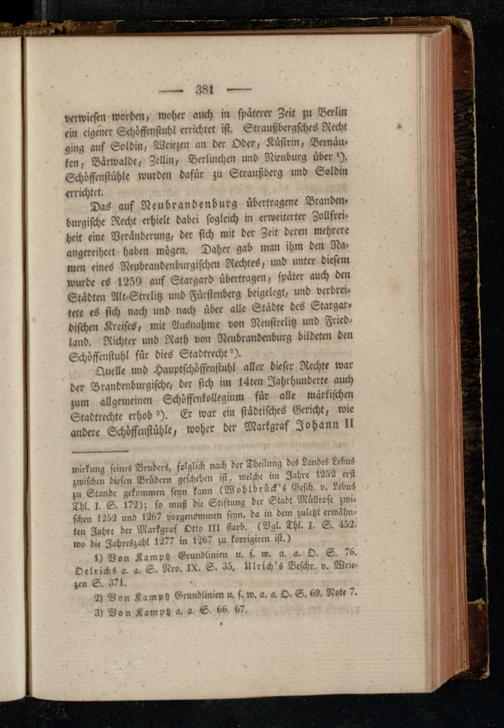 Quelle und Hauptschöffensiuhl aller dieser Rechte war der Brandenburgische, der sich im I4ten Jahrhunderte auch zum allgemeinen Schöffenkollrgium für alle märkischen Stadtrechte erhob»). Er war ein städtisches Gericht, wie andere Schöffenstühle, woher der Markgraf Johann H
