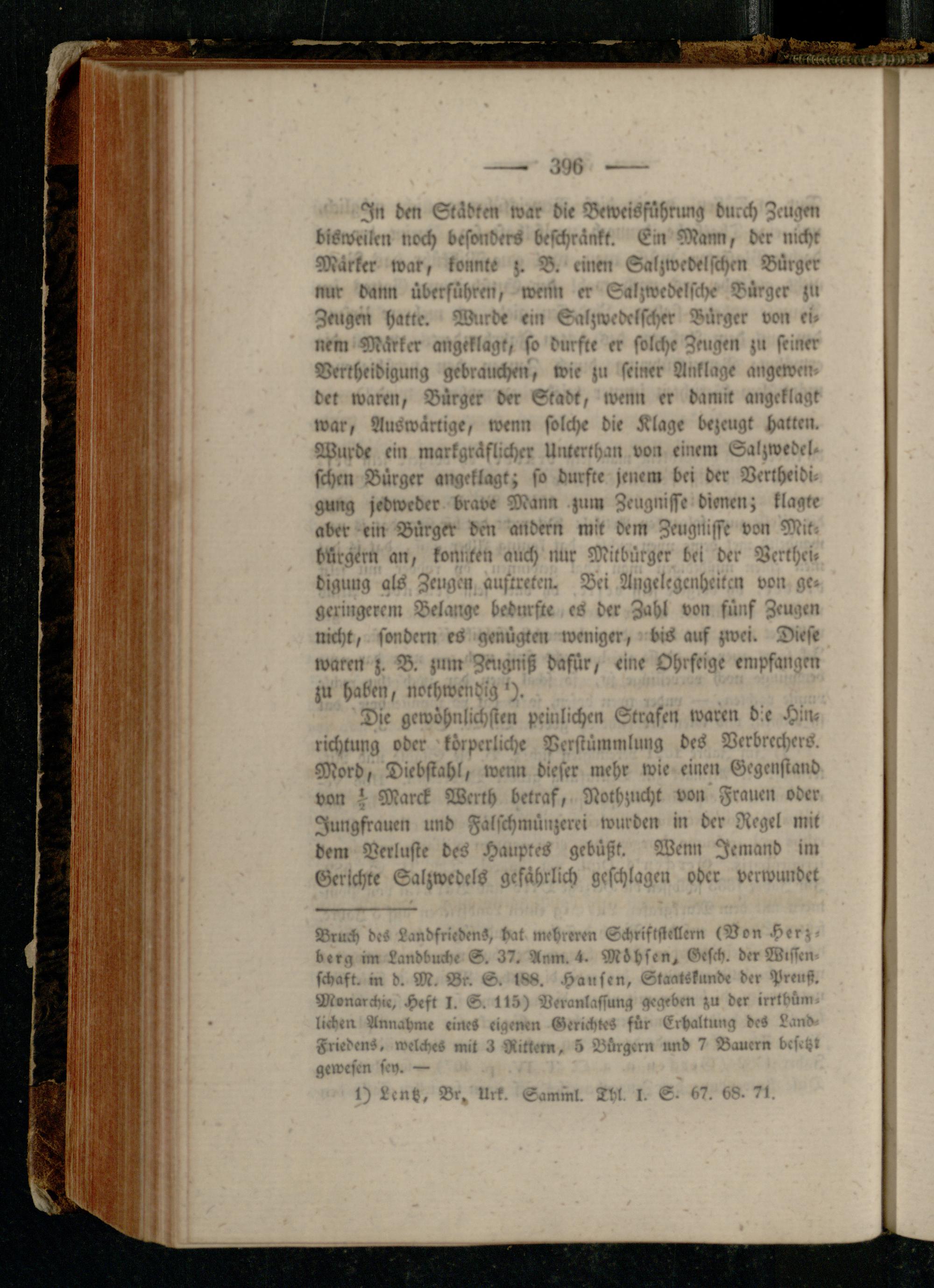 Die gewöhnlichsten peinlichen Strafen »varen die Hin« richtung oder körperliche Verstümmlung des Verbrechers. Mord, Diebstahl, wenn dieser mehr wie einen Gegenstand von ' Marck Werth betraf, Nachzucht von Frauen oder Jungfrauen und Falschmünzerei wurden in der Regel mit dem Verluste des Hauptes gebüßt. Wenn Jemand im Gerichte SalzwedelS gefährlich geschlagen oder verwundet