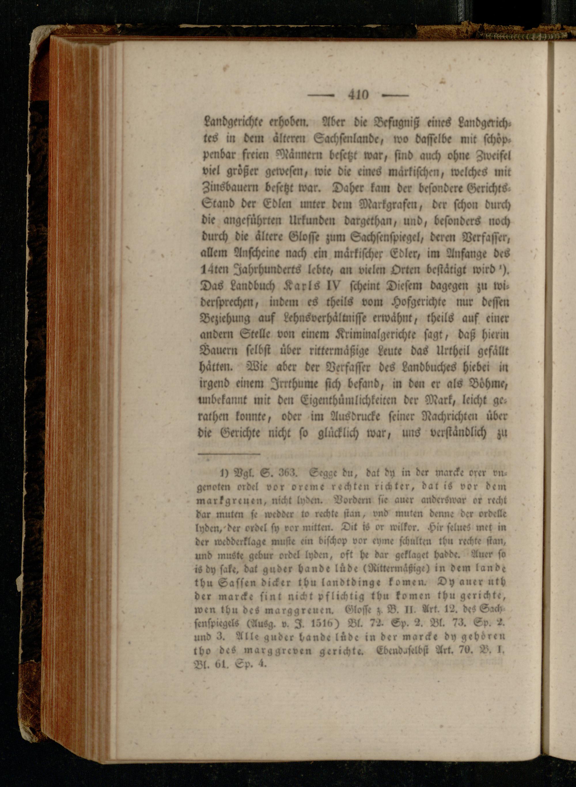 Landgericht, erhoben. Aber di, Befugniß eines Landgerich. tes in dem älteren Cachsenlaabe, wo dasselbe mit schöp, penbar freien Männem besetzt war, sind auch ohne Zweifel viel größer gewesen, wie die eines märkischen, welches mit Zinsbauern besetzt war. Daher kam der besondere Gerichts Stand der Edlen unter dem Markgrafen, der schon durch die angeführten Urkunden dargethan, und, besonders noch durch die ältere Glosse zum Sachsenspiegel, deren Verfasser, allem Anscheine nach ein märkischer Edler, im Anfänge des I4ten Jahrhunderts lebte, an virlm Orten bestätigt wird'). Das kandbuch Karls IV scheint Diesem dagegen zu wi» versprechen, indem es theils von» Hofgerichte nur dessen Beziehung auf Lehnsverhältnisse erwähnt, theils auf einer andern Stelle von einem Kriminalgerichte sagt, daß hierin Bauern selbst über rittermäßige Leute das Urtheil gefällt hätten. Wie aber der Verfasser des Landbuches hiebei in irgend einem Jrrthume sich befand, in den er als Böhme, unbekannt mit den Eigenthümlichkeiten der Mark, leicht M rachen konnte, oder im Ausdrucke seiner Nachrichten über die Gerichte nicht so glücklich war, unS verständlich zu