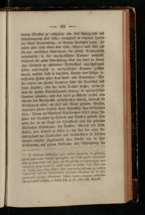 blutige Straft» zn vollzieht», wie das Lehnsgericht und Schuldengericht über Edle, wenigstens in einzelnen Lheilen der Mark Brandenburg, an Beamte überlasten hatte. Es wurde aber nicht allein über Edle, sondern auch über alle übrigen märkischen Unterthanen die höclstke Kriniinaljustiz ursprünglich in der markgräflichen Kammer ausgcübt. Während die ganze Untersuchung über den eines an Haupt oder Gliedern zu -ahndenden -Verbrechens angcschuldigten Edlen ursprünglich in markgräflicher Kammer geführt wurde, verblieb diese in deusclben, Bauern oder Bürger betreffenden Fällen zwar dem Land» oder Stadtrichter. Die» srr richtete an zweien Terminen über die Frevelthat und deren Urheber; aber der dritte Termin nnchte, indem jenem die höchst« Kriiiiiiialgewalt abging, in markgräflicher Kammer gehalten, und das darin zu fällende Unheil vom Munde des Markgrafen ausgesprochen werden, wodurch die Verhängung, aller, an Leib und Leben gehender Strafen, ungeachtet zweier Urtheile seiner Beamten, ihm Vorbehalten blieb. Indem der Markgraf Waldemar IZlZ jedem Inhaber des Gerichtes in Städten und' Dörfern zustand, über jeden der i» der Regel die Todesstrafe nach sich ziehenden Verbrechen Schuldigen, des Raubes, Mordes und Dieb, stahls, zwei Urtheile zu fällen-), lag das der alten Ge- richtSgcwalt'der Stadtrichtcr und Gerichtsherrn in Dörfern hiermit ertheilte Zugeständnis; ohne Zweifel nur in ihrer Erweiterung auf jeden Verbrecher mit Nichtachtung der