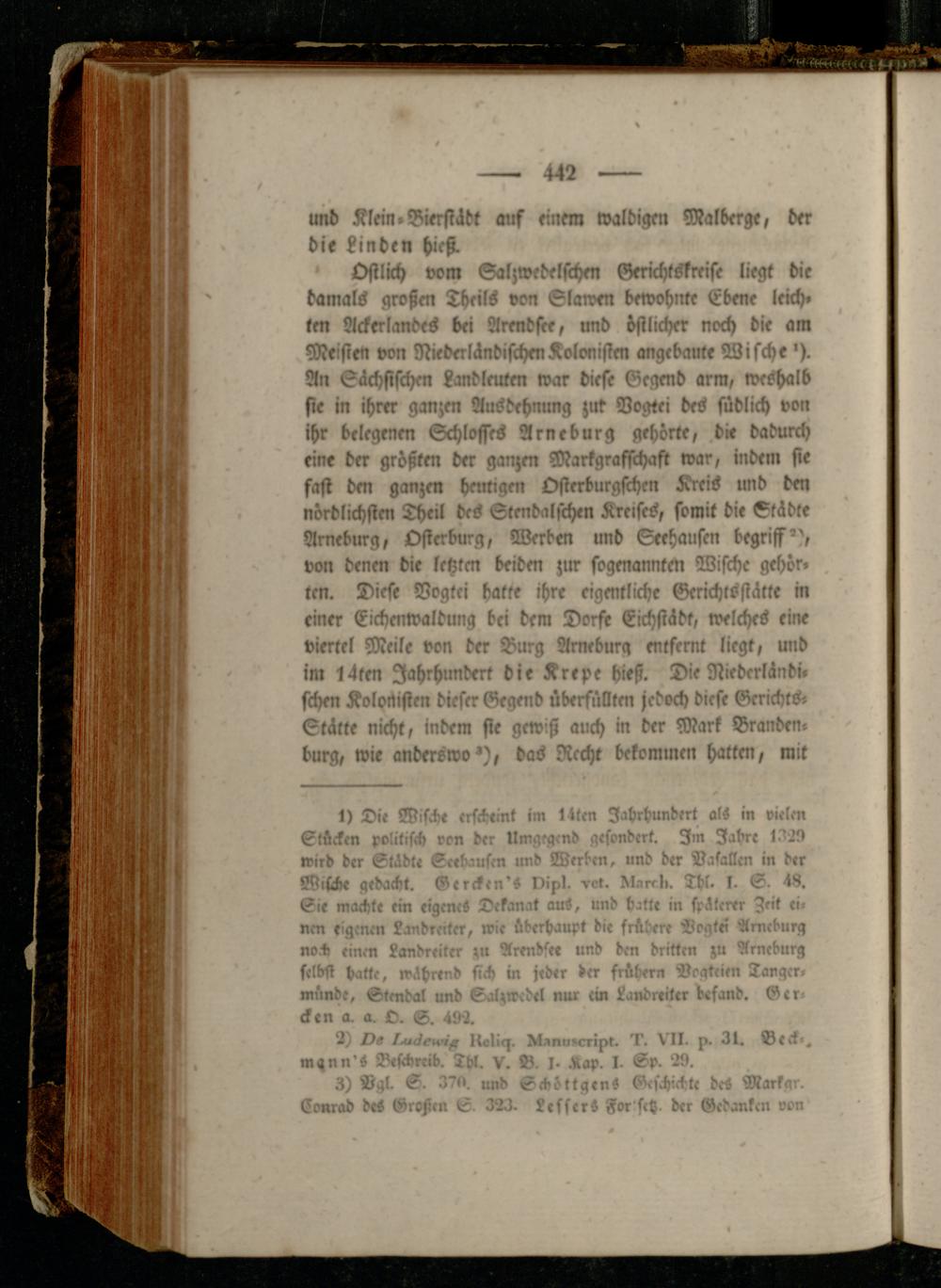 Östlich vom Salzwedelschm Gesichtskreise liegt die damals großen TheilS von Slawen bewohnt« Ebene leich» tm Ackerlandes bei Arendfee, und östlicher noch die am Meisten von Niederländischen Kolonisten angebaute Wische An Sächsischen Landleuten war diese Gegend arm, weshalb sie in ihrer ganzen Ausdehnung zut Dogtei deS südlich von ihr belegen«, Schlosses Arneburg gehörte, die dadurch eine der größten der ganzen Markgrafschaft war, indem sie fast dm ganzen herttigen Ostrrburgschen Kreis und dm nördlichsten Theil deS Stmdalschen KreiseS, somit bi« Städte Ameburg, Osterburg, Werden und Serhaufen begriff"", von benm die letzten beiden zur sogmannten Wische gehör, tcn. Diese Dogtei hatte ihre eigentliche GerichtSstätte in einer Eichenwaldung bei dem Dorfe Eichstädt, welches eine viertel Meile von der Burg Ameburg entfernt liegt, und im l äten Jahrhundert die Krepe hieß. Die Niedcrlänbi» schm Kolonisten dieser Gegend überfüllten jedoch diese Gerichts- Stätte nicht, indem sie gewiß auch in der Mark Brandenburg, wie anderswo*), das Recht bekommen hatten, mit