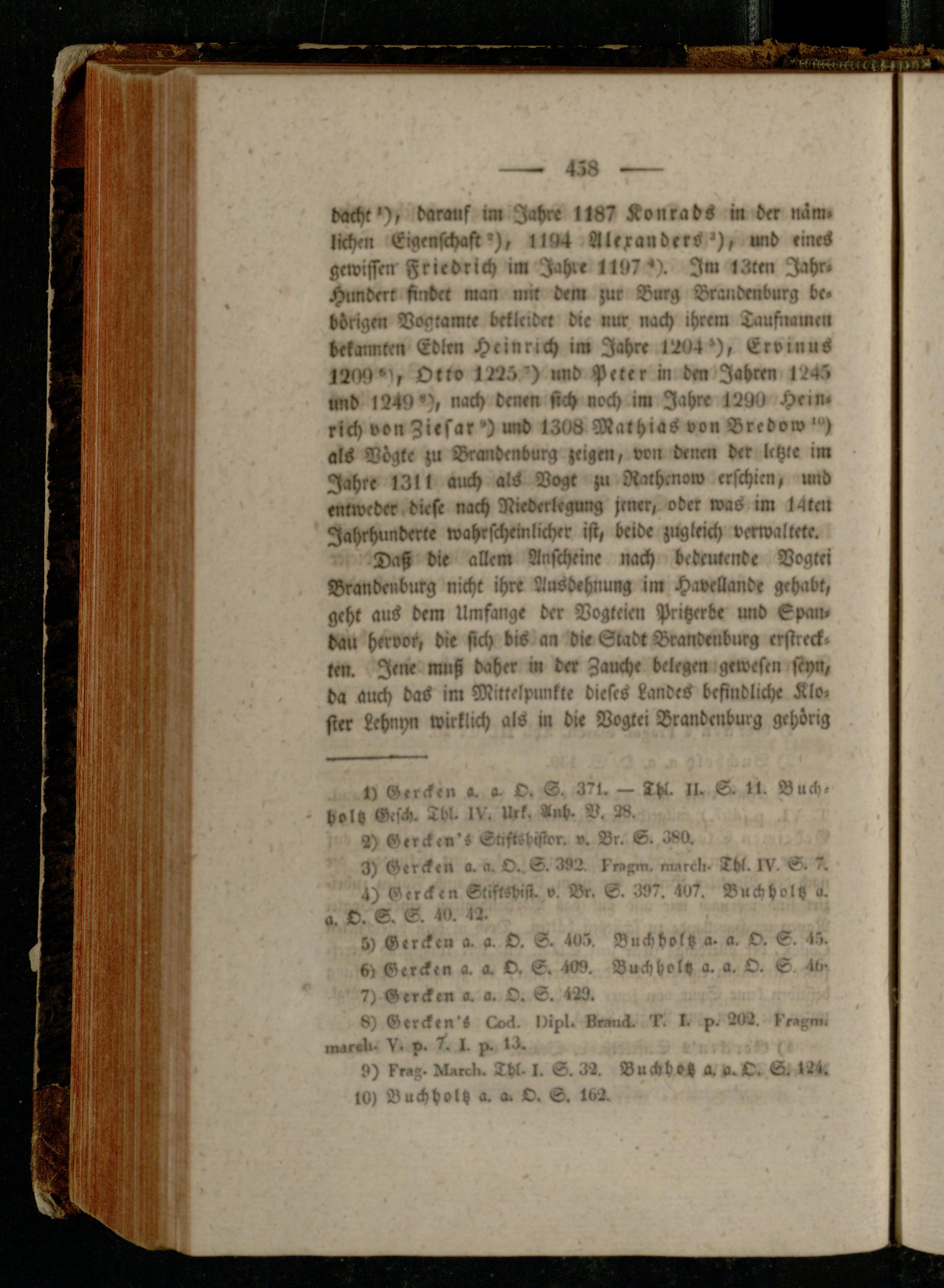 dacht'), darauf im Jahre 1187 Konrads in der näm» liehen Eigenfchast»), 1184 Alexanders»), und eines gewissen Friedrich im Iahte 1197»). Im 13tm Jahr« Himberk find« man mtt dem zur Borg Brandenburg be« bdrigm Doaramke bekleidet die nur nach ihrem Taufnamen bekannten Edlen Heinrich im Jahre 1204»), Ervinus 1209»), Otto IN.'»') und Peter in den Jahren 1245» nnd 1249»), nach denen sich «och im Jahre 1290 Heinrich von Zirsar*) und 1308 Mathias von Bredow als Vögte ;u Brandenburg jeigen, von denen der letzte im Jahre 1311 auch als Vogt ;u Rathenow erschien, und entweder diese nach Riederlrgung jener, oder waü im 14teil Jahrhunderte wahrscheinlicher ist, beide zugleich verwaltete.