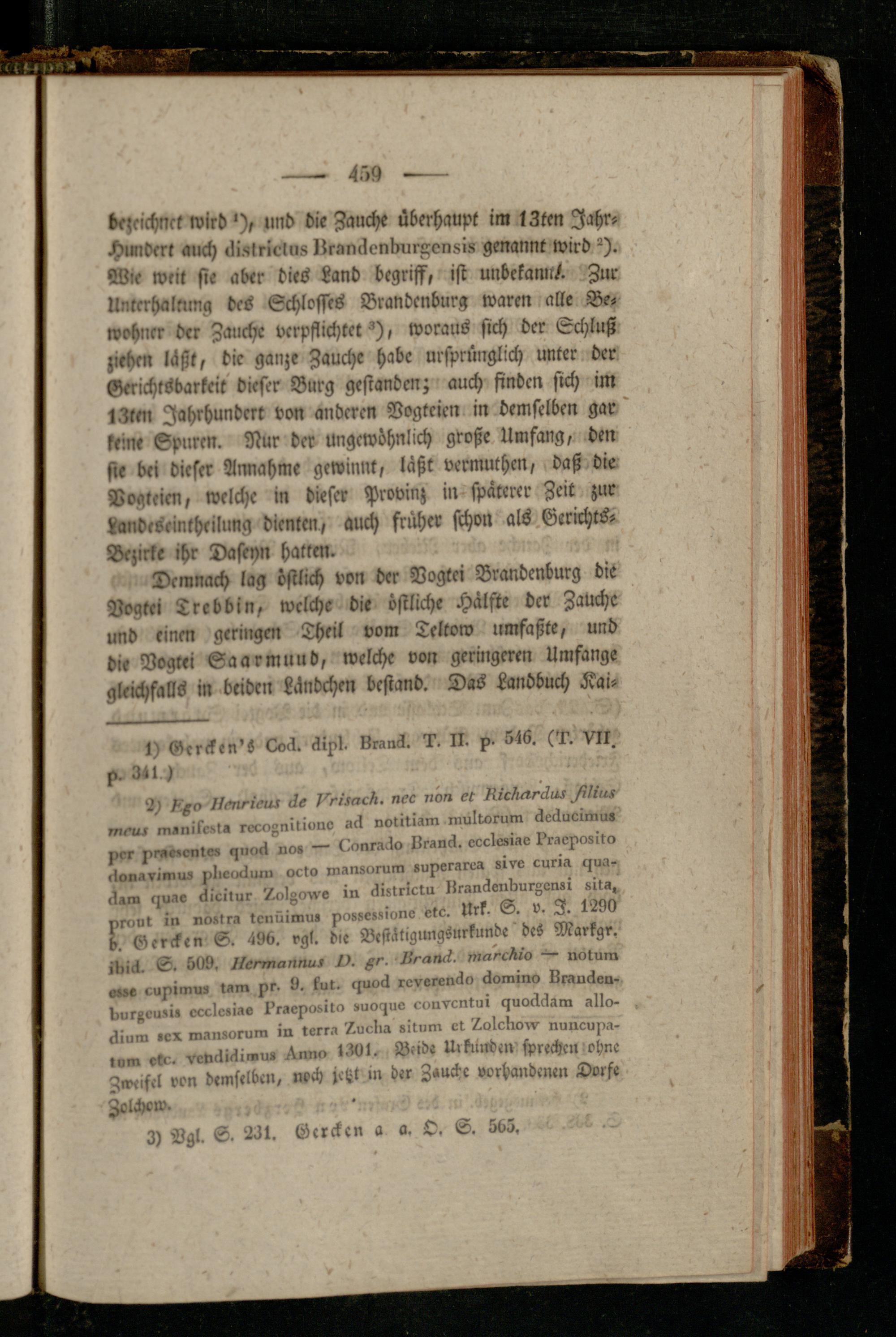 bezeichnet wird '), und die Zauche überhaupt im 13ten Jahr- Hundert auch «lislrielns lirnnilenburxensiü genannt wird ^). Wie writ sie aber dies Land begriff, ist unbekanu/. Jur Unterhaltung des Schlosses Brandenburg waren alle Bewohner der Zauche verpflichtet^), woraus sich der Schluß ziehen läßt, die ganze Zauche habe ursprünglich unter der Gerichtsbarkeit dieser Burg gestanden; auch finden sich im 13km Jahrhundert von anderen Vogtcicn in demselben gar keine Spuren. Nur der ungewöhnlich große Umfang, den sie bei dieser Annahme gewinnt, läßt vermuthcn, daß die Vogteicn, welche in dieser Provinz in spaterer Zeit zur jiandeseintheilung dienten, auch früher schon als Gerichts- Bezirke ihr Daseyn hatten.