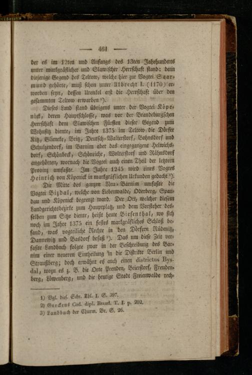 Die Mitte des ganzen Neu. Barnim umfaßte die Vogte« Bijdal, welche von Liebenwalde, Oderberg, Spandau und Köpenick begrenzt ward. Der Ort, welcher diesem Landgerichtsbezirke zum Hauptplatz, und dem Vorsteher desselben zum Sitze diente, heißt heute Biesenthal, wo sich noch im Jahre 1375 ein festes markgräfliches Schloß befand, was vogtciliche Rechte in den Dörfern Rüdenitz, Dannewitz und Basdorf besaß«). Das um diese Zeit verfaßte Landbnch folgte zwar in der Beschreibung des Bar, nim einer neueren Eintheilung ln die Distrikte Berlin und Ctraußberg; doch erwähnt es auch einen Nstrictu-j ,1al, wozu es z. B. die Orte Prenden, Bcierstorf, Freudenberg, Löwcnberg, und die heutige Stadt Freienwalde rech.