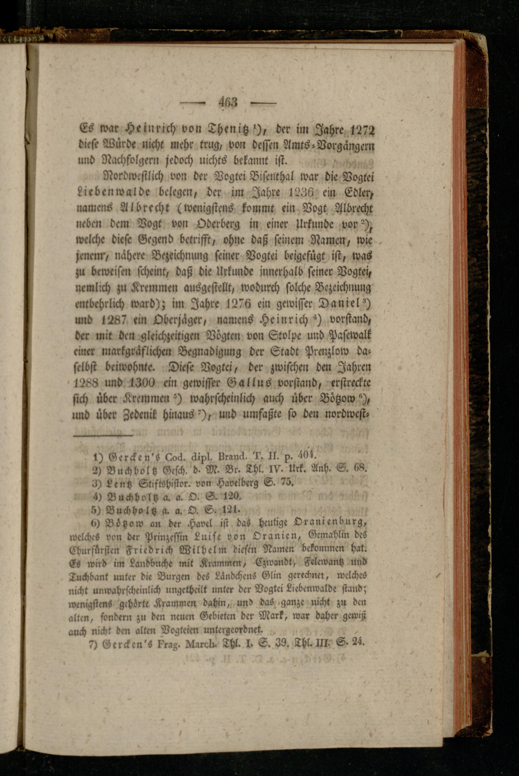 6) Bötzow an der Havel ist das heutige Oranienburg, welche- von der Prinzessin Luise von Oranien, Gemahlin des Churfürsten Friedrich Wilhelm diesen Namen bekommen hat. -s wird im Landbllche mit Krammen, Czwandt, Felewantz und Tuchbant unter die Burgen des Ländchens Glin gerechnet, welche- nicht unwahrscheinlich ungctheilt unter der Dogtei Liebenwalde stand; »venigstens gehörte Krainmen dahin,, und das ganze nicht zu den alten, sondern zu den neuen Gebieten der Mark, war daher gewiß auch nicht den alten Vogteien untergeordnet.