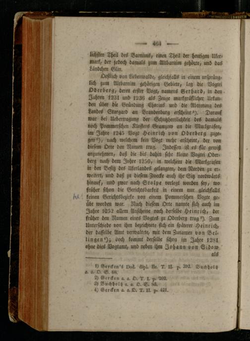 Oestiich von kicbenwalde, gleichfalls in einem Ursprung, lich ;um Altbarnim gehörig« Gebiete, lag die Vogkri Oderberg, der« erster Vogt, namens Gerhard, in den Jahren 1231 und 1236 als Zeuge markgräflicher Urkunden über die Gründung Ehorms und die Abtretung des Landes Stargard an Brandenburg erscheintDarauf war bei Uebertraguno der Gchutzherrlichkeit des damals noch Pommerschen Klosters Gramzoiv an die Markgrafen, im Jahr« >245 Vogt Heinrich von Oderberg zuge. gm'), nach welchem kein Vogt mehr erscheint, der von diesem Orte dm Namen trug. Indessen ist es für gewiß anzunehmen, baß die bis dahin sehr kleine Vogtei Oder» berg nach dem Jrchre 1250, in welchem di« Markgrafen in den Besitz des Ukerlandes gelangten, dem Norden zu er» weitert, und daß ;u diesem Zweck« mich ihr Sitz nordwärts hinauf, und zwar nach Stolpe verlegt worden sty, wo früher schon die Gerichtsbarkeit in einem nur gleichfalls ^' keinm Gerichtsbetirke von einem Pommerschen Vogte ge» übt worden war. Nach diesem Orte nannte sich auch im Jahre 1Ü52 allem Anschein« nach derselbe Heinrich, der früher dm Namen eines Vogtes zu Oderberg trug'). Zum Unterschiede von chm bejkichnete sich ein späterer Heinrich, der dasselbe Amt verwaktcte, mit dem Zunamen von Bel» lingen*); ooch kommt derselbe schon im Jahre 1281 ohne dies Dogtamt, und neben ihm Johann von Sidow '