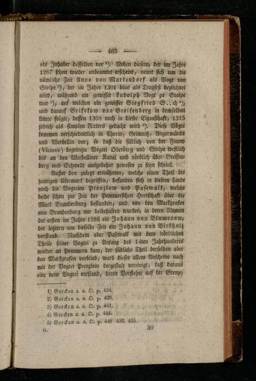 Außer den zuletzt erwähnten, welche einen Theil der heutigen Ukermark begriffen, befanden sich in diesem Lande noch die Vogteien Prenzlow und Pasewalk, welche beide schon zur Zeit der Ponnnerschen Herrschaft über die Mark Brandenburg bestanden, und von den Markgrafen von Brandenburg nur beibehalten wurdeit, in deren Namen der ersten ün Jahre 1286 ein Johann von Blumenow/ der letztem »m dieselbe Zeit ein Johann von Birkhol; Vorstand. Nachdem aber Pasewalk mit dem nördlichen Theile seiner Vogtei zu Anfang des Icken Jahrhunderts wieder an Pommern kam, der südliche Theil derselben aber den Markgraftir verblieb/ ward dieser allem Anscheine nach mit der Vögten Prenzlow dergestalt vereinigt, daß daraus eine neue Vogtei entstand, deren Vorsteher auf der Grenze/