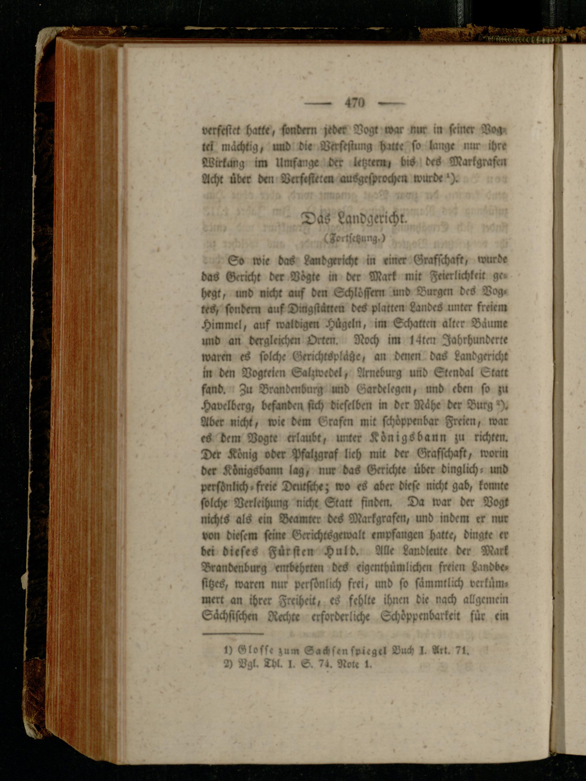 So wie das Landgericht in einer Grafschaft, wurde bas Gericht der Vögte in der Mark mit Feierlichkeit ge. hegt, und nicht auf den Schlössern und Burgen des Bog. tes, sondern auf Dmgstänm des platten Landes unter freiem Himmel, auf waldigen Hügeln, im Schatten alter Bäume und an dergleichen Orten. Noch im täten Jahrhunderte warm es solche GerichtspläHe, an denen das Landgmcht in den Dogteien Saizwedel, Arneburg und Stendal Statt fand. Zu Brandenburg und Garbelegen, und eben so zu Havelbcrg, befanden sich dieselben in der Nähe der Burg'). Aber nicht, wie dem Grafen mit schöppenbar Freien, war es dem Vogte erlaubt, unter Königsbann zu richten. Der König oder Pfaljgraf lieh mit der Grafschaft, worin der Kömgsbann lag, nur das Gerichte über dinglich» und persönlich.fteie Deutsch«; wo es aber diese nicht gab, konnte solche Verleihung nicht Statt finden. Da war der Vogt nichts als ein Beamter des Markgrafen, und indem er nur von diesem seine Gerichtsgewalt empfangen hatte, dingte er bei dieses Fürsten Huld. Alle Lavdleute der Mark Brandenburg entbehrten des eigenthümlichen freien Lands«, fitzes, waren nur persönlich frei, und so sämmtlich verküm» merk an ihrer Frecheil, es fehlte ihnen die nach allgemein Sächsischen Rechte erforderlich« Schöppenbarkrit für rin