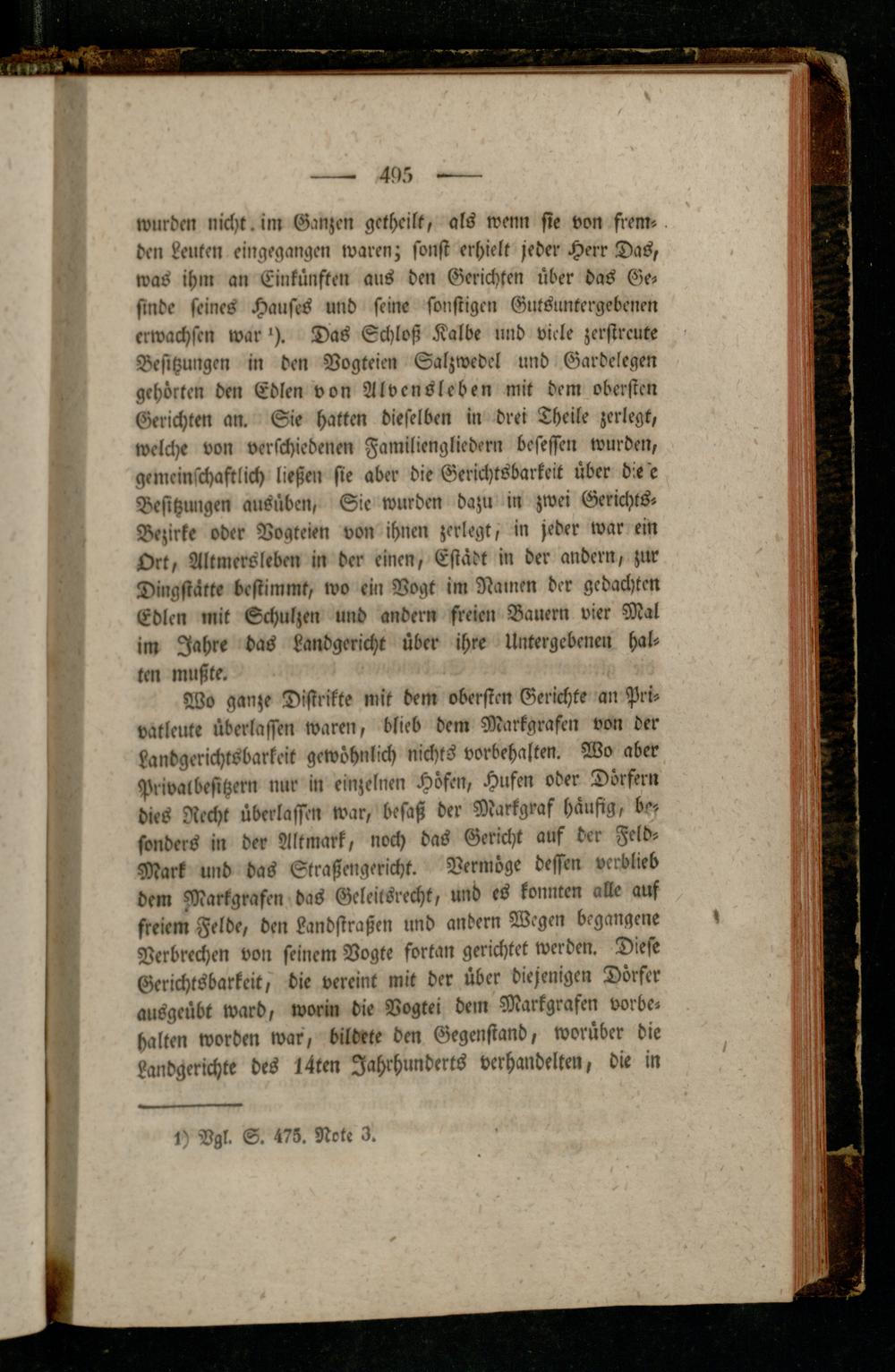 Wo ganze Distrikte mit dem obersten Gerichte an Privatleute überlassen waren, blieb dem Markgrafen von der Landgerichtsbarkcit gewöhnlich nichts Vorbehalten. Wo aber Privatbesitzern nur in einzelnen Höfen, Hufen oder Dörfern dies Recht überlassen war, besaß der Markgraf häufig, besonders in der Altmark, noch das Gericht auf der Feld- Mark und das Straßengericht. Vermöge dessen verblieb dem Markgrafen bas Geleitsrecht, und es konnten alle auf freiem Felde, den Landstraßen und andern Wegen begangene Verbrechen von seinem Vogte fortan gerichtet werden. Diese Gerichtsbarkeit, die vereint mit der über diejenigen Dörfer ausgeübt ward, worin die Vogtei dem Markgrafen Vorbehalten worden war, bildete den Gegenstand, worüber die Landgerichte des l4ten Jahrhunderts verhandelten, die in