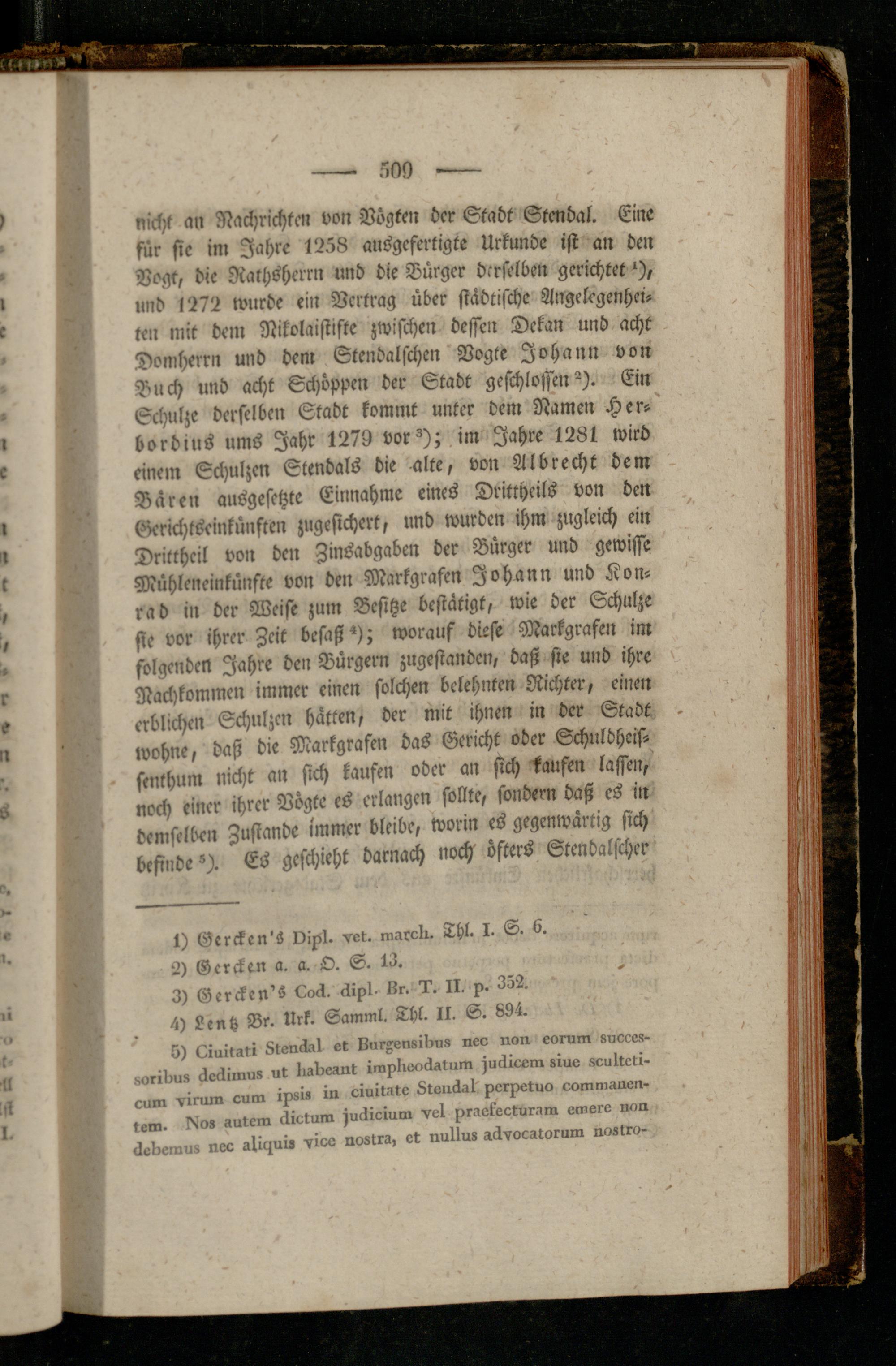 nicht an Nachrichten von Vögten der Stadt Stendal. Eine für sie in, Jahre 1258 ausgcftrtigte Urkunde ist an den Vogt, die Rathshcrrn und die Bürger derselben gerichtet'), und 1272 wurde ein Vertrag über städtische Angelegenheiten mit dem Nikolaististe zwischen dessen Dekan und acht Domherrn und dem Stendalschen Vogte Johann von Buch und acht Schöppen der Stadt geschloffen^). Ein Schulze derselben Stadt kommt unter dem Namen Her-' bordius ums Jahr 1279 vor'); im Jahre 1281 wird einem Schulzen Stendals die alte, von Al brecht dem Bären ausgesetzte Einnahme eines Dritcheils von den Gerichtseinkünften zugesichert, und wurden ihm zugleich ein Drittheil von den Zinsabgaben der Bürger und gewisse Mühlencinkünfte von den Markgrafen Johann und Kon- rad in der Weise zum Besitze bestätigt, wie der Schulze sie vor ihrer Zeit besaß*); worauf diese Markgrafen im folgenden Jahre den Bürgern zugestanden, daß sie und ihre Nachkommen immer einen solchen belehnten Richter, einen erblichen Schulzen hätten, der mit ihnen in der Stadt . wohne, daß die Markgrafen das Gericht oder Schnldheis- senkhum nicht an sich kaufen oder an sich kaufen lassen, noch einer ihrer Vögte es erlangen sollte, sondern daß es in demselben Zustande immer bleibe, worin es gegenwärtig sich befinde'). Es geschieht darnach noch öfters Stendalscher