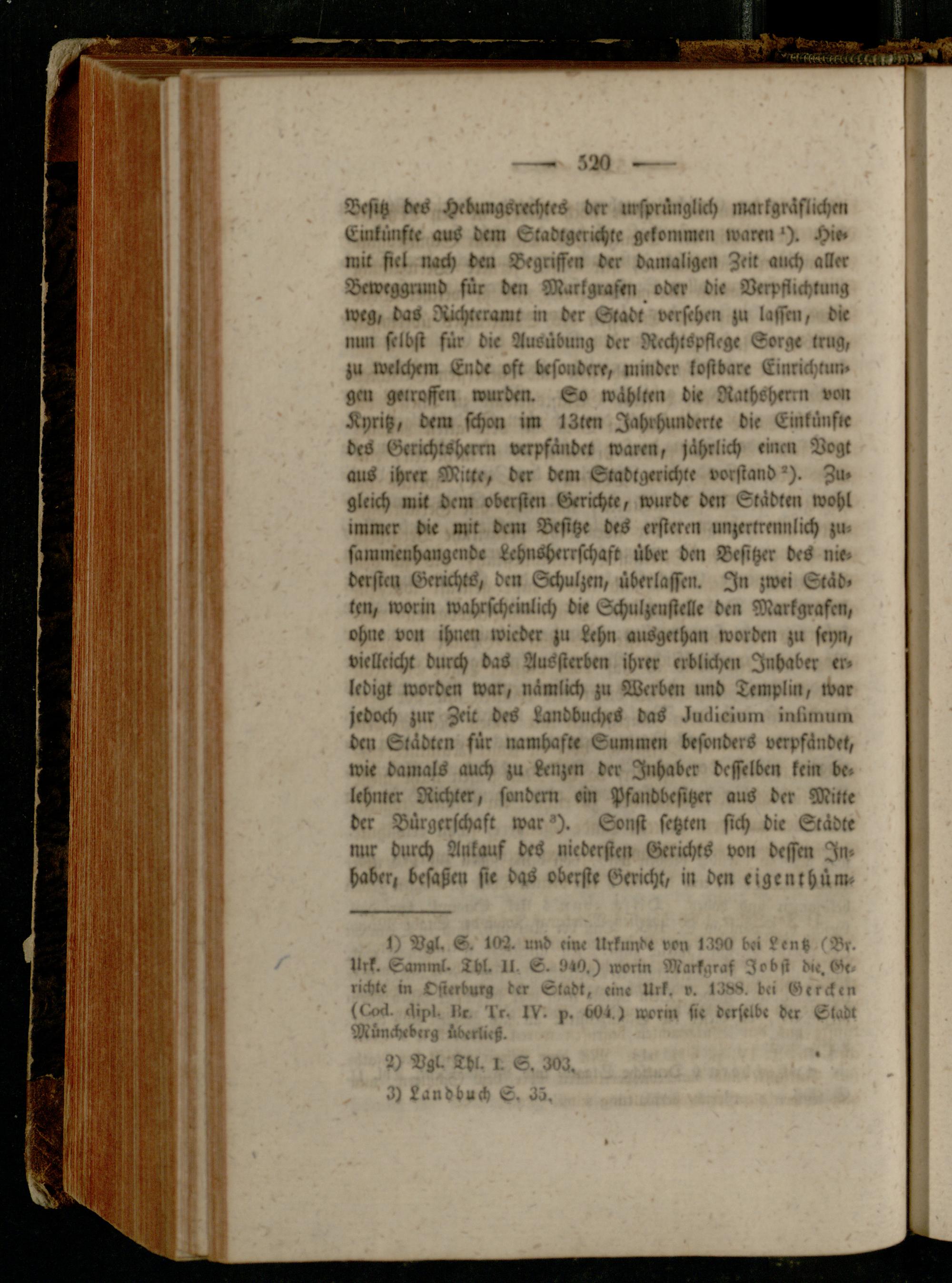 Besitz des Hebungsttchtes der ursprünglich markgräflichm Ewlüilfre aus dem Stadtgerichte gekommen wam>'). Hi»» mit fiel nach dm Begriffen der dainaligm Zeit auch aller Beweggrund für den Markgrafen oder di« Verpflichtung weg, das Rächtcrawt m der Grabt versehen zu lassen, die nwr selbst für die Ausübung der Rechtspflege Sorg« trug, zu welchem End« oft besondere, minder kostbare Einrichmn» gm geiroffen wurden. Co wählten die Ratheherm von Kyritz, dem schon im 13tm Jahrhunderte die Einkünfte des Gericht-Herrn verpfändet warm, jährlich «mm Vogt aus ihrer Mitte, der dem Stadtgerichte Vorstand'). Zu» gleich mit dem obersten Gerichte, wurde dm Städten wohl immer d»e mit dem Besitz« des ersteren unzertrennlich zusammenhängend« Lchnüherrschaft über dm Besitzer des nie» bersten Gerichts, den Schulzen, überlassen. In zwei Stäb» len, worin wahrscheinlich di« Schulzeufiellt den Markgrafen, ohne von ihnen wieder zu Lehn ausgethan worden zu seyn, vielleicht durch das Aussterbm ihrer erblichen Inhaber er» ledigt worden war, nämlich zu Werben und Templm, «Var jedoch zur Zeit des Handbuches das äuüicium inlimum dm Städten für namhafte Cummm besonders verpfändet, wie damals auch zu Lenzen der Irchabcr desselben kein de» lrhiiter Richter, sondern ein Pfaiidbrsiher aus der Mitte der Bürgerschaft war'). Sonst setzten sich die Städte nur durch Ankauf deS niedersten Gerichts von dessen In» Haber, besaßm sie dgs oberste Gericht, in den eigenkhüm»
